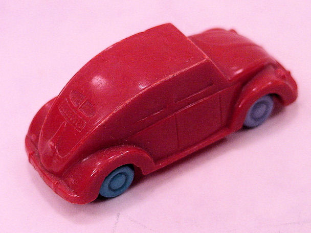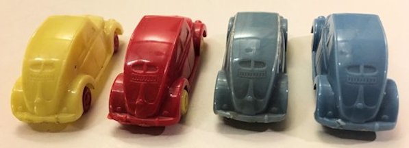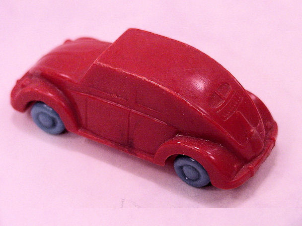 Plastic body with solid windows and details of the front and rear hood, doors and headlights. No chassis and the blue, red or yellow plastic wheels are with wire axles attached to the body. There is a round mold mark under the front hood and under the back part of the roof.