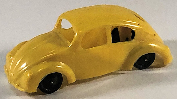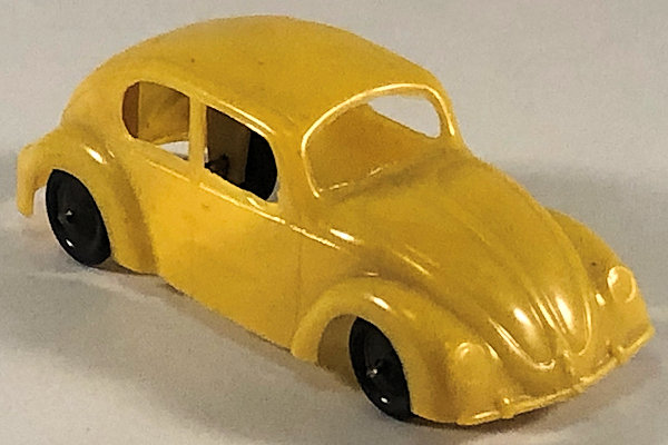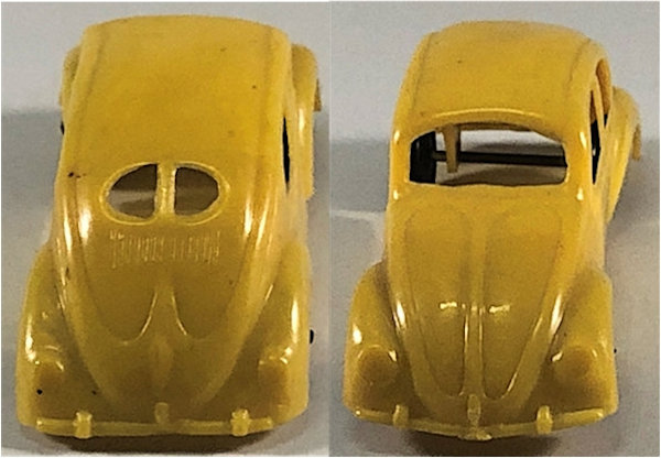 One-piece thin brittle plastic model with cut out windows. Body has door seam lines, front hood handle, headlights, license plate light and round taillights. Front and rear bumpers with guards are molded into the body. No chassis or markings except for two round mold marks inside the roof. The black plastic wheels are mounted on metal axles. They are attached to the body separately on extended body pillars. The rear split window has 14 air louvers.
