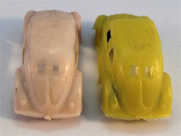A blister pouch is known with as contents 2 of these split beetles and 2 other makes. This blister pouch is stamped “Made in Hong Kong”. An oval version of this toy also exists.