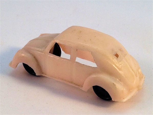 Soft plastic body with open windows with details of the front and rear hood and doors. No chassis with black plastic wheels and axles. Three small mold marks under the roof and under the front and rear hood. No marking. Very cheap production.