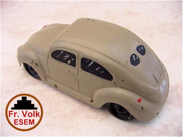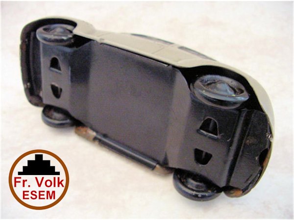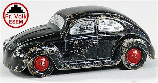Also a variation exists with a VOLK KdF Wagen mounted on a wooden platform with an electric light also attached to the wooden platform. Some models exist with an embossed raised circle with the Fr. VOLK ESEM insignia on the door. Some early versions had the chassis marked with "Fr. VOLK ESEM". Also a Volk with bumpers that was used as a coinbox; unclear whether this was a later modification though. See pictures.