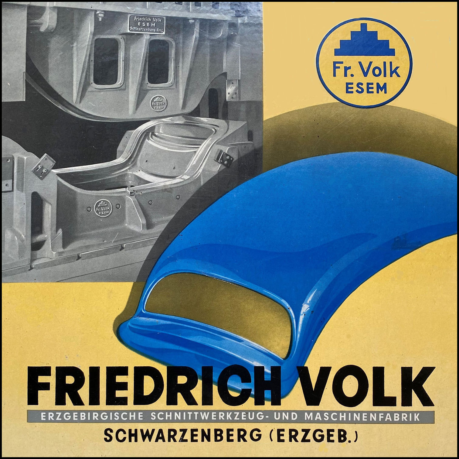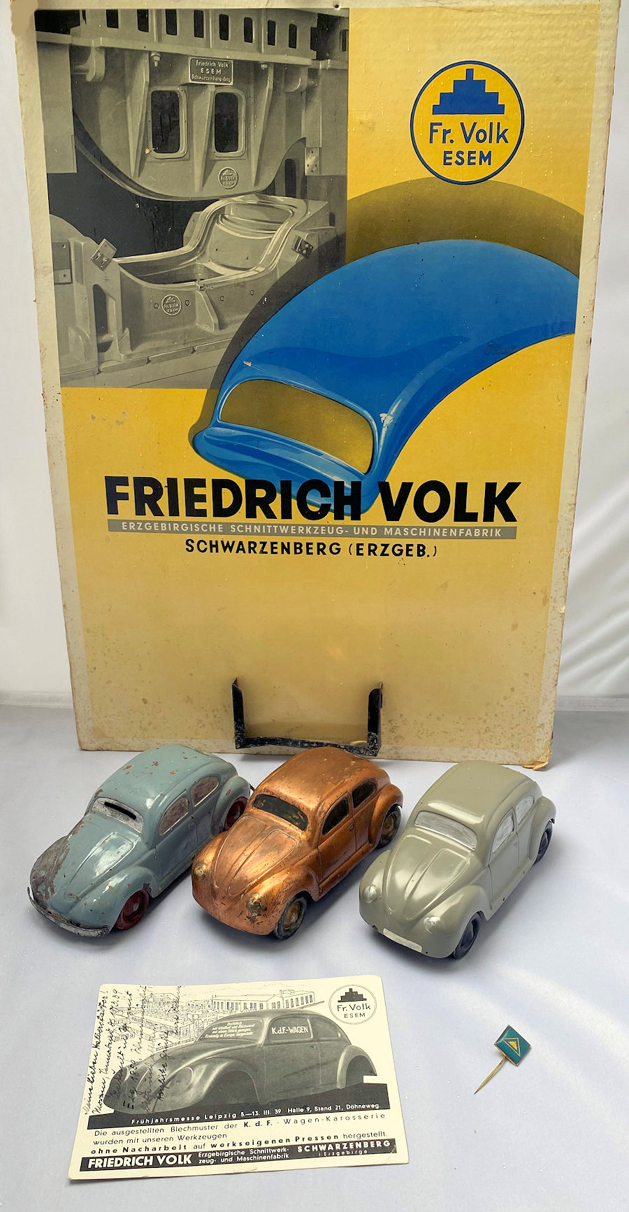 Volk went in the late 1930's to exhibitions to market their company and products. They used cardboard displayboards with a picture of their machinery and KdF Volkswagen bodypanels. See enclosed picture.