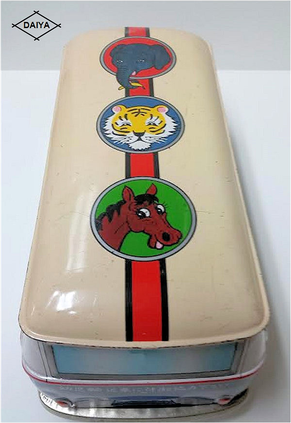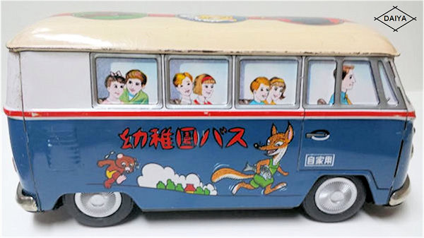 A definitely charming and well-proportioned tin lithographed VW Bus toy with solid windows. Different lithograph versions were produced for the German market like the POLIZEI, VERKERHRSUNFALL BEREITSCHAFT, others for the US market like the Police and the School bus. The tin chassis has either a friction motor or a battery operated electric motor with control and lights. Rubber tires with metal hubcaps.