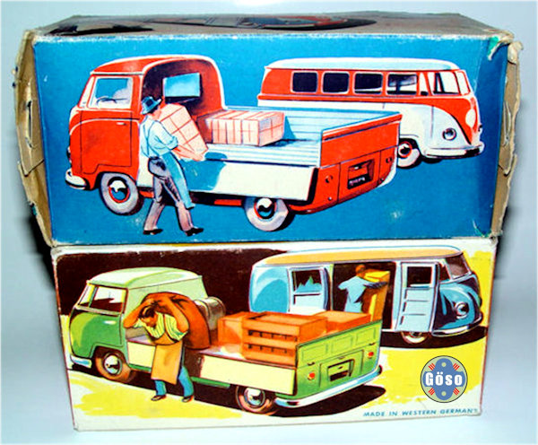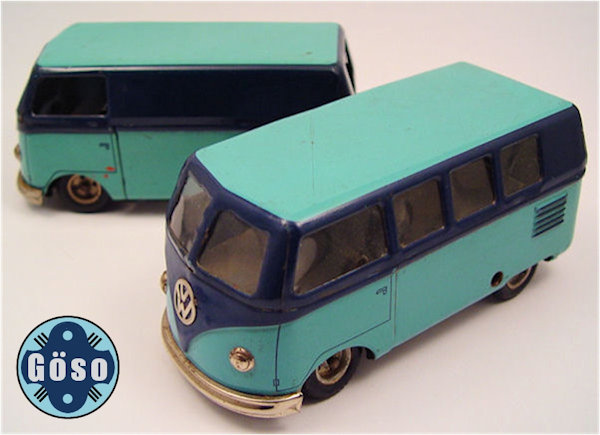 Probably one of the earliest existing tin toys produced of the VW Kombi, Panel Van and Pickup. It has nice body details with colorful lithograph artwork and designs. The Panel Van and Kombi had double side doors but these GÖSO Busses had only one large door that opened, probably to save manufacturing costs. All the VW Busses are “barn door” style representing a pre-1955 era, despite being produced thought the 1960s. The probably rarest version is the Circus Bus with license plate No 410. Also a Panel Van for the German QUELLE Company, a catalogue warehouse, are seldom found. Still rare are the Post version and the ADAC version representing a German Automobile Association vehicle. They come either with a friction motor or key wound clockwork motor with rubber tires on metal rims. There were Finnish and Danish copies of the GÖSO VW Bus by the two toy manufacturers, HIHRA (based in Turku, Finland) and WITTROCK.