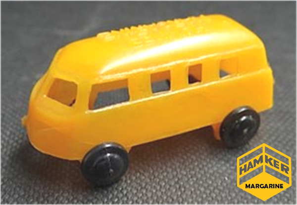 This little plastic vehicle was made in the shape of a VW Passenger and also a Cargo Bus and was a promotional toy for the HAMKER Company, established 1906, which was and is one of the leading Companies with regard to fats, mayonnaise, margarine, etc. in Europe. HAMKER is not the actual manufacturer of the VW Bus itself, but used it for promotion purposes. It was part of a series of various automobiles. The plastic body is 32 mm long, but with the tow hook it measures 37mm. The body has cut out windows, no chassis and the black plastic wheels attach to the body. Inside the roof it is numbered 1 and on top of the roof it reads “HAMKER MARGARINE”.