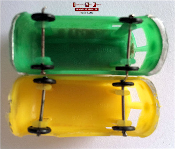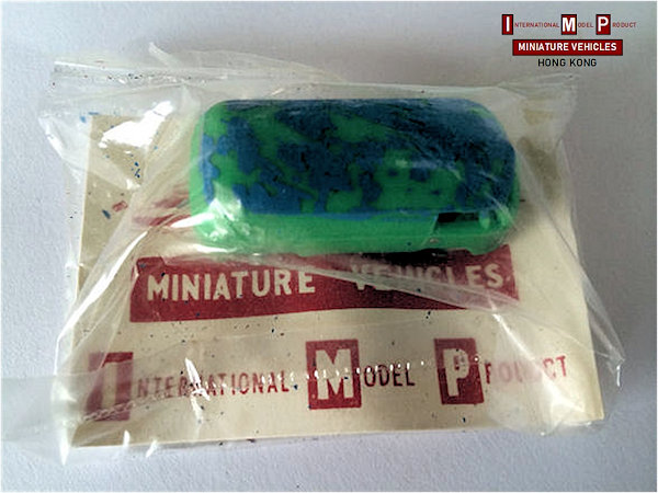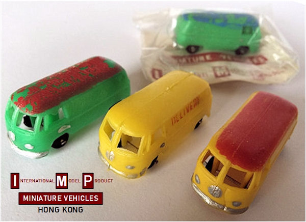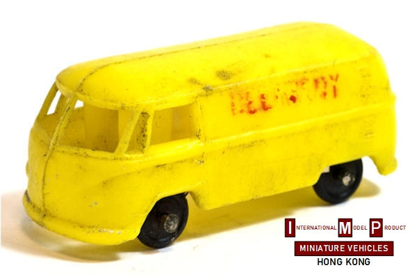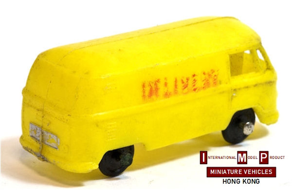 A plastic (polythene) body in the shape of a VW Panel Bus with cut out windows and details of the front, headlights, door seams, side louvers and engine lid with white license plate. The plastic injection mold came apart down the center of the VW Bus as there is a mold mark line. Silver painted front and rear bumpers, headlights and front VW emblem. No chassis and the black plastic wheels with metal axles attach to the body with pillars of the body mold. Front and rear bumpers molded in the body. A version has red colored letters of DELIVERY printed on the sides of the body. Some have the roof painted a different color Inside the roof is stamped MADE IN HONG KONG. This VW Bus model bears a strong resemblance to the LESNEY MATCHBOX VW Bus V1