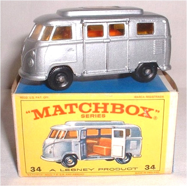 A further variation was the No. 34-D Volkswagen Camper with a low roof, first released in 1968. At this time, LESNEY was producing hundreds of thousands of toys each week, and one of their sidelines was selling vinyl plastic carrying cases for the models. It was found that the Volkswagen Camper was too tall to fit in the cases properly, so the casting was altered to lower the roofline. The model is otherwise identical to the 34-C. A late variation was the addition of a lip to the bottom of the front bumper, so the Camper could be pulled by a MATCHBOX tow truck. These high-quality MATCHBOX models were extremely popular worldwide, and have formed the starting point for many toy collections.