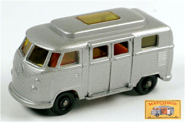 The third version of the MATCHBOX No. 34 was the Volkswagen Camper, first released in 1966. Known to collectors as the 34-C, the Camper VW was silver and had a high roof. It had cutout windows and opening cargo doors on the left side. Body details included door seams, side air louvers and engine lid with license plate No. MG-M515. The window inserts were molded in transparent orange plastic. The black diecast baseplate had working suspension, black plastic wheels, and was riveted to the body.