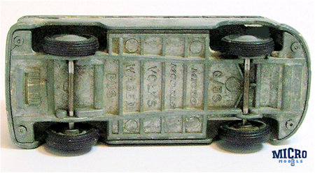A diecast metal body with cut out windows and good details of the VW Combi Bus. Details include cab doors and side door seams, front hood VW emblem, headlight, taillights, side air louvers and engine compartment door. Front and rear bumpers are casted into the body and there is no interior. The chassis is marked G/36, Micro Models, Volkswagen Bus. Diecast rims with rubber tires on metal axles attach to the chassis. The chassis is joined to the body with 4 rivets.