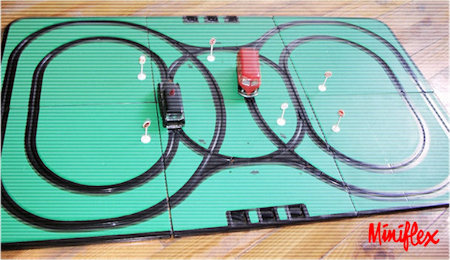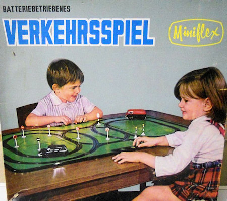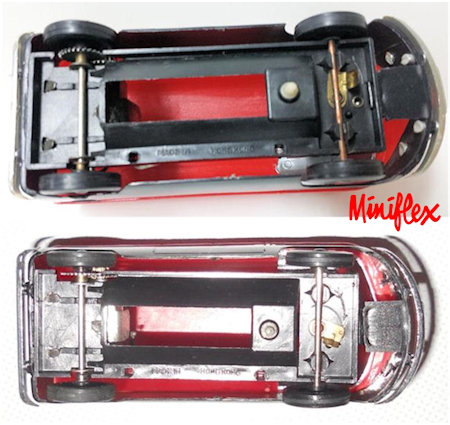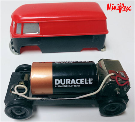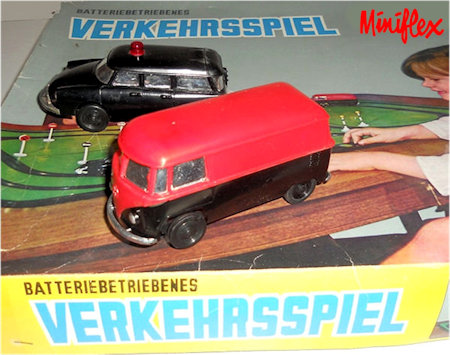 A two piece plastic body with cut out windows and a removable plastic chassis. Wheels are plastic pressed on steel axles. Bumpers, headlights and window inserts are silver plated plastic. It has a small electric motor and takes one C cell battery. Small brass tab on the bottom is a switch which turns the motor on and off. Cab, cargo doors side vents, engine lid and VW logo are outlined on the body. This MINIFLEX VW Bus was in a slot car track set along with a Citroen DS car. It was either issued in German (Verkehrsspiel) or English (Traffic Game).