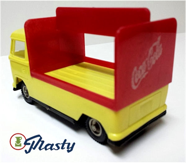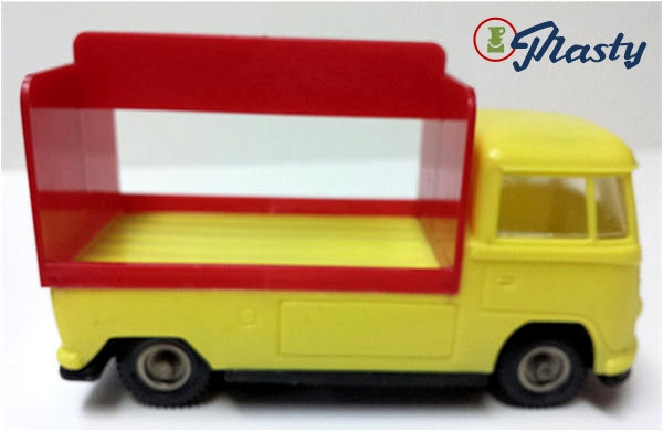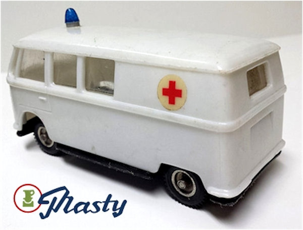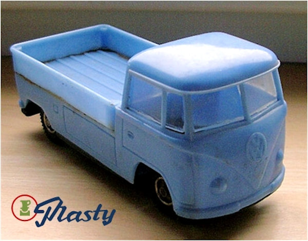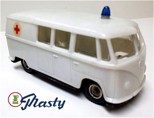 Plastic body with cut out windows and a clear plastic window insert. Very good details of front and rear section, door seams and side air louvers. Bumpers, headlights, taillights and front VW emblem molded into the body. Black plastic chassis with friction motor attached to the body. The PLASTY VW Bus (passenger, cargo or pick up) came stock or various themes such as POST, ADAC, Hay Wagon and Ambulance to name a few.