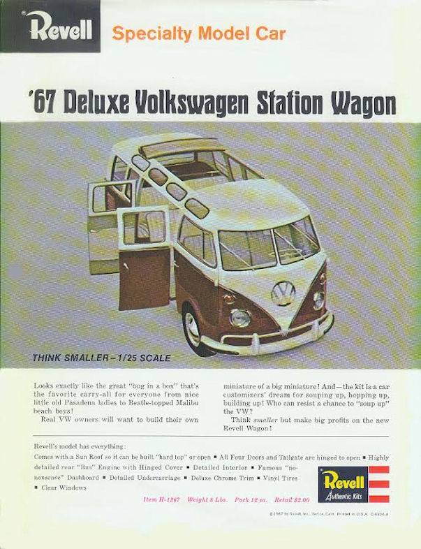 Due to the overwhelming popularity of the VW Bus in the 1960s, REVELL reissued its Microbus model as the DELUXE VOLKSWAGEN STATION WAGON (H-1267). The kit was similar to the 1958 issue (V1), but with details of the 1967 21-window model. The kit featured a detailed engine, undercarriage, running gear, chrome hubcaps on plastic wheels with rubberlike tires and full interior with seats, dashboard, controls and door panels. Body details included hinged doors and engine lid, beltline trim, bumpers, skylight windows, chrome front VW emblem, and the sunroof could be built open or closed. Clear plastic windshields and skylight windows were included, along with a sheet of clear plastic and templates in the instructions for the builder to cut his own windows. This REVELL VW Bus model was later reissued in several variations, but without the passenger Bus details of the originals.