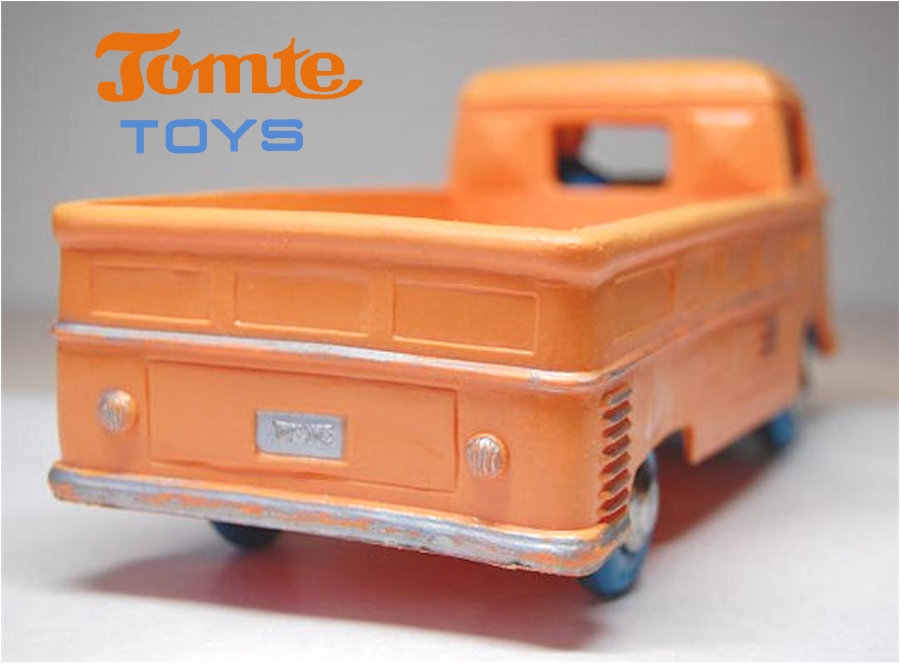 A one piece vinyl VW Pickup Bus with open windows and two passengers, a father and a son. Their production number was 754. Body molded with headlights, turn signals, front VW emblem, taillights and license plate lights. It furthermore has a steering wheel and hubcaps.