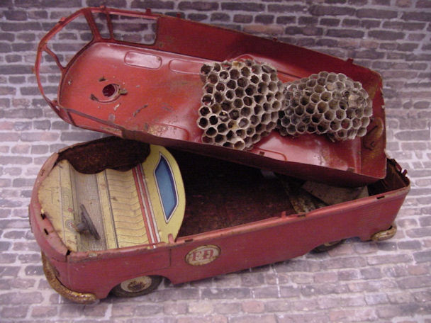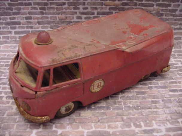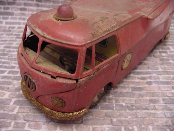 This BANDAI Fire Department Bus was found in a barn and had been parked there for some time, after surviving some heavy duty play time and weather conditions. This type of VW Panel Bus itself, in excellent condition, is very collectable, especially with the Fire Department theme, nice detailing lines and check out those roof windows on a panel Bus. Now looking at this rusty crusty BANDAI beater Bus with the smashed in roof, oxidized paint, dirt, rust, no need to go on, why and where do you start. Actually, the best thing the Bus has going for itself is that it is complete, not missing any parts and I had the vision of making it an ADAC autobahn vehicle conversion. I was contemplating getting a tetanus shot in case I get some rusty cuts during the project but decided to just get going, taking things apart.