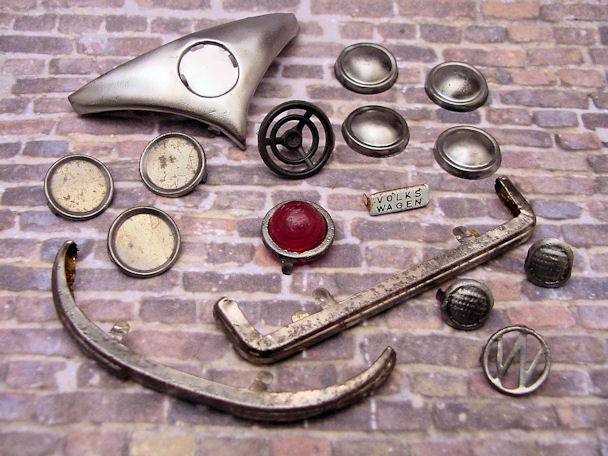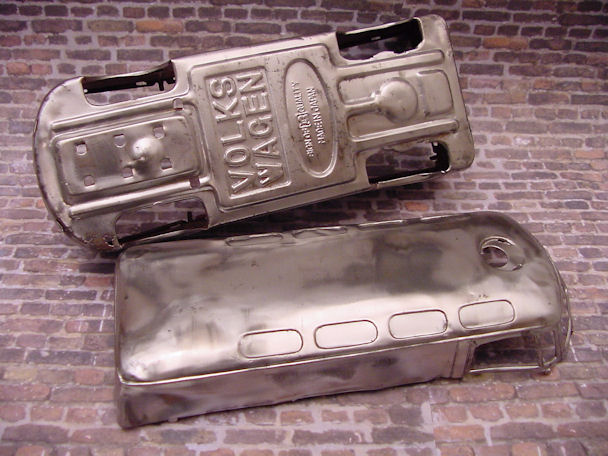 The VW Bus is built in three tin sections, lower/chassis, roof and front clip. Using a spring hook and going through the windows and wheel wells, the connecting tabs were bent open and the top was removed from the lower section. WOW, did I ever open up a hornet’s nest and was very surprised to discover what was inside – just that – a pair of hornet’s nests. I guess you could call them VW Bugs when they were around and fortunately, they had left the nest some time ago. Once the top was off, the roof light, front clip, lithographed interior, rear wheel assembly, paper resonator and friction motor was removed. The tin pieces such as the 3 round FD emblems, headlights, “W” emblem, bumpers and rear license plate was also removed. Now the process of smoothing out the dents, paint striping, cleaning and figuring out what is the best way to handle the condition of some of the parts. For example, the tin nickel-plated bumpers were rusty and pitted and could not be polished so they would have to be filled and painted.