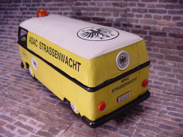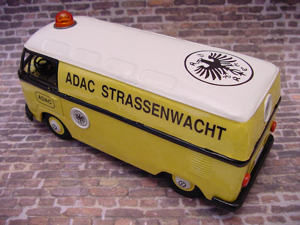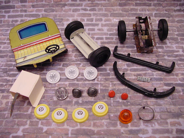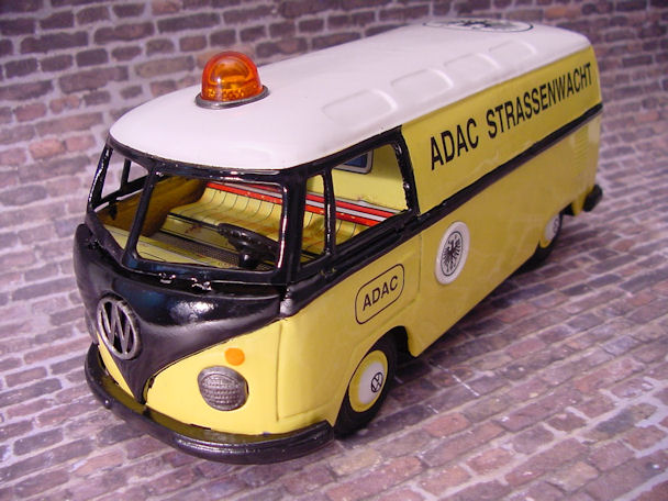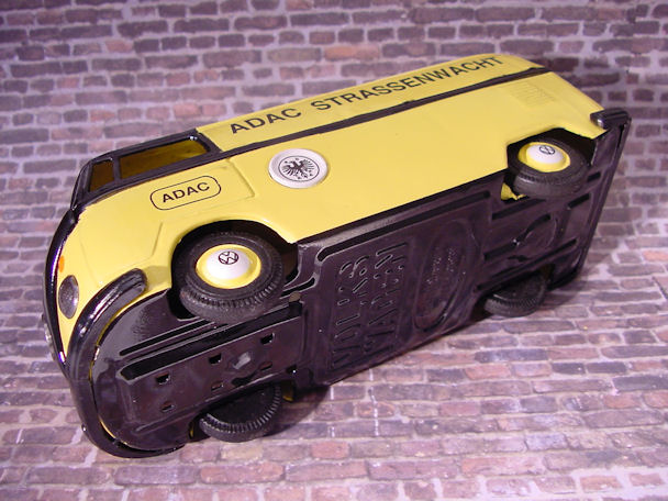 The friction motor was cleaned and oiled and the original paper resonator was used as a pattern to make a new resonator. I also decided to make some red taillights for the VW Bus using some brass brads. An orange roof light was found and would be better suited for the ADAC theme instead of the red original light. Although the Bus was left in the barn under the weather conditions, the tin lithograph interior was still in good condition and cleaned up very nice with a cleaner wax. Now the Bus was ready for final assembly. Starting with the lower/chassis section, the wheel assembly, paper resonator, friction motor, bumpers, headlights, “W” insignia, taillights and rear license plate were carefully attached. The front clip and tin lithograph interior were attached next to the lower/chassis section. The orange light and metal bezel were then attached to the roof section. The roof section was then mated to the lower/chassis section being careful lining up the metal tabs and bending them over with a wooden stick and not damaging the paint. OK, now the project is completed and the BANDAI ADAC Restor-Version Bus shines in all its glory.