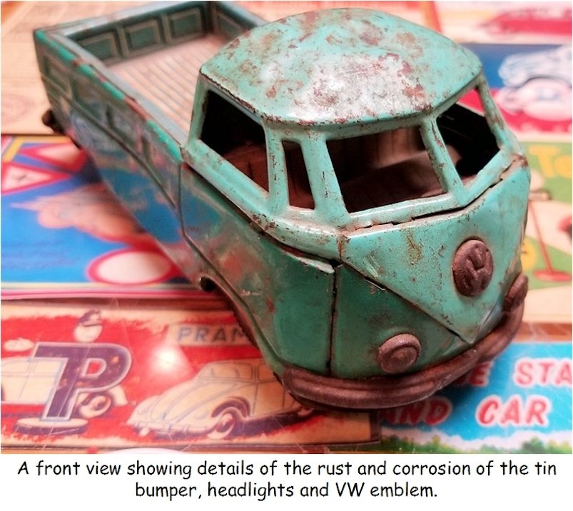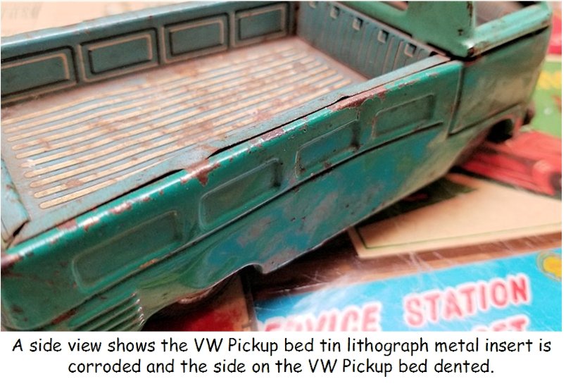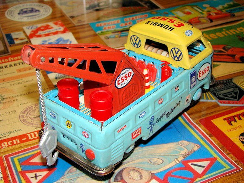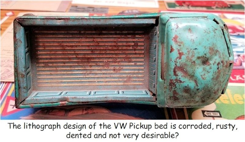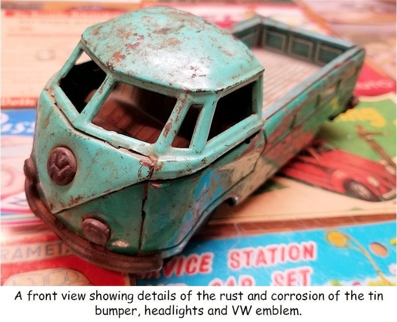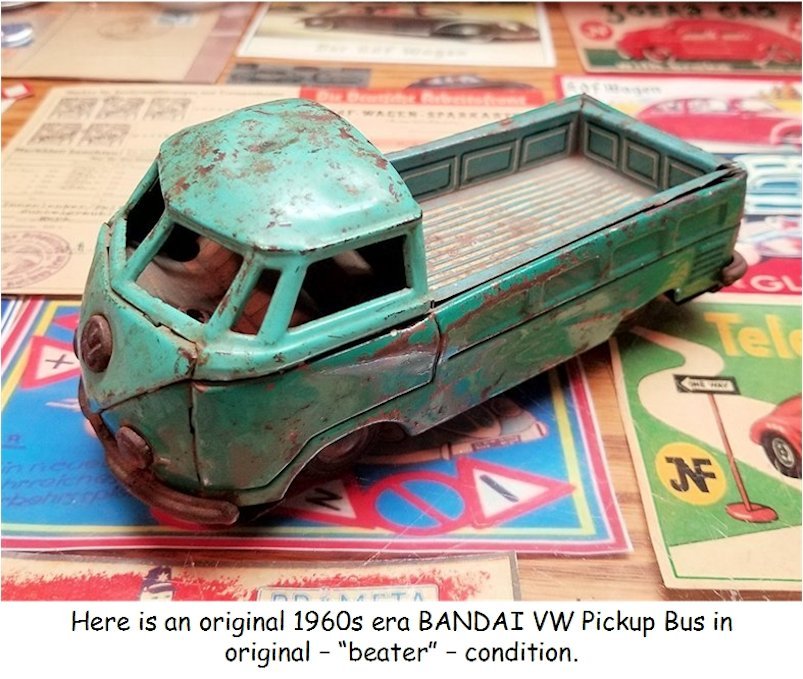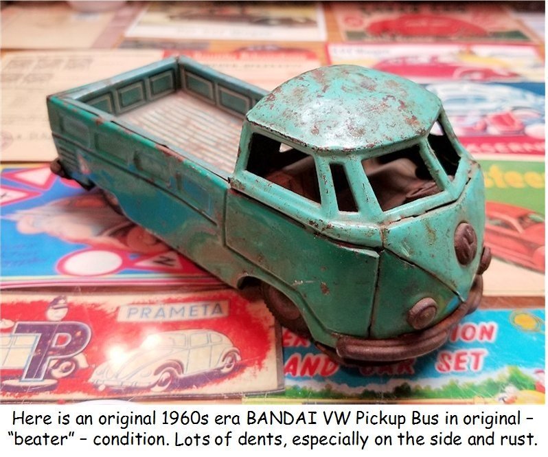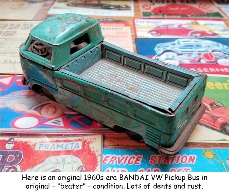 I picked up this 1960s BANDAI VW Pickup Bus some years ago as it was rusty, dented and in need of repair. I also had an extra wrecker boom from another vehicle and thought of making a VW Wrecker Bus.
