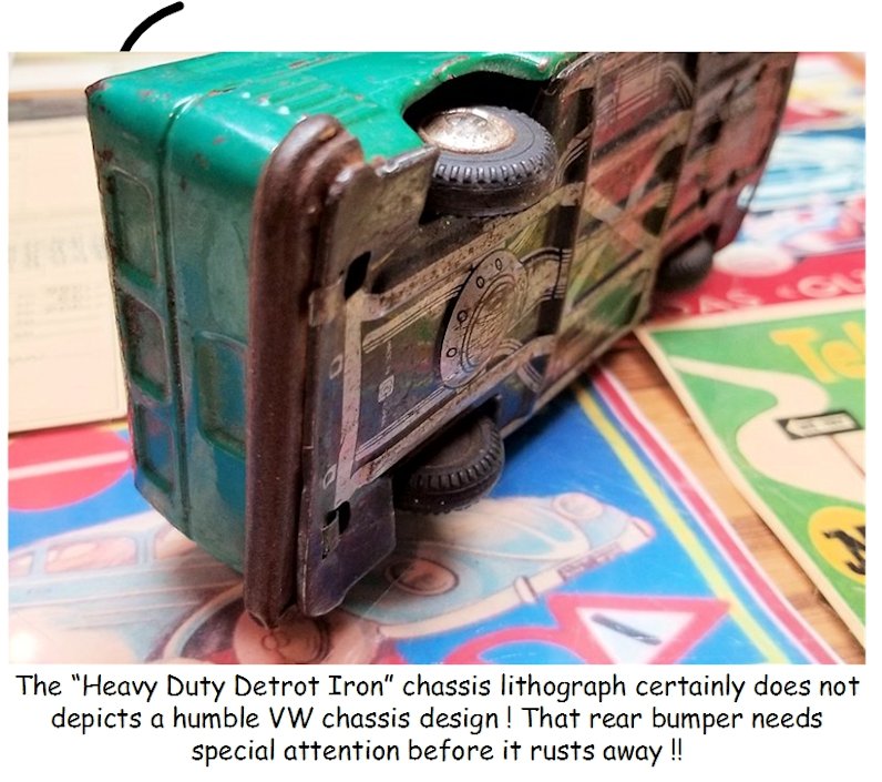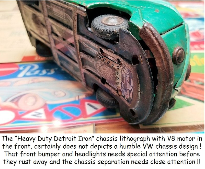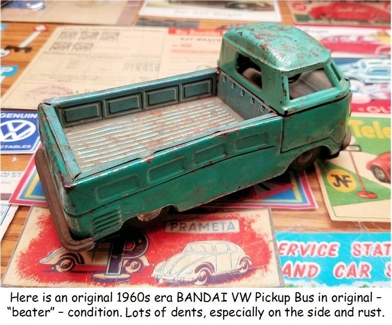 The BANDAI VW Bus was taken apart, sand blasted, body repairs done and painted. The small tin parts were cleaned, painted or polished. The friction motor and tires were made like new.