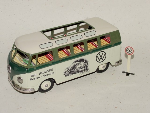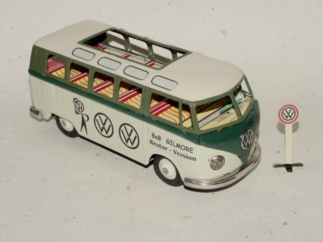 The BANDAI VW Buses was taken apart, sand blasted, body repairs done and painted. The small tin parts were cleaned, painted or polished. The friction motor and tires were made like new.