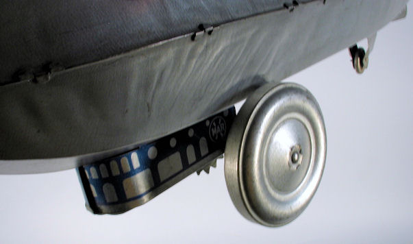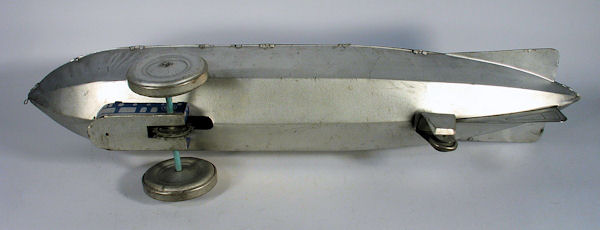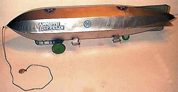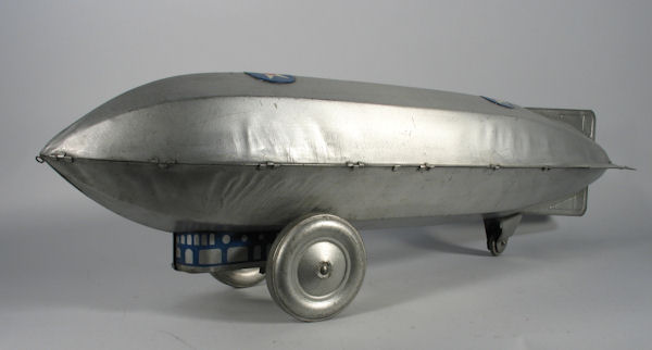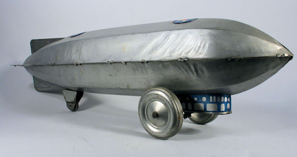 MARX Toys produced several toy Zeppelins in the 1930s. The smaller Zeppelins were the MONARCH ZEPPELIN (385mm long) and the TRANS-ATLANTIC ZEPPELIN (255mm long). The larger scale MARX Toys Zeppelin were made of 30 gauge steel sheets that were stamped out in two sections, upper and lower. The sections had long stamping lines that ran front to back. The two sections had many bent over tabs crimped together along the seam lines and formed the body and also the horizontal fins. A sheet metal gondola was attached to the lower section with bent over tabs locked into place with cutouts in the lower section. Inside the gondola area were several parts that included two pressed steel wheels and axle attached to the gondola. There was a spring steel strip that rubbed against a large gear on the axle to make a clicking sound when the Zeppelin was moving.