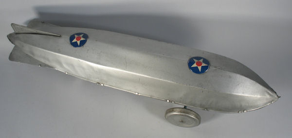 The MARX Toy Zeppelin was about 27 inches (686mm) in length and was painted in a very nice silver color. There were also two large round discs that had decals of a five pointed red, blue and white star attached to the top of the upper section. There was a decal wrapped around the gondola to simulate windows and doors. There was another version of this Zeppelin that used a different decal set. The decal set theme was a red and blue MAMMOTH ZEPPELIN lettering on the sides of the upper section above the gondola. The MARX logo was on the sides of the upper section and on the gondola. This Zeppelin also had 4 engines with propellers attached to the lower section.