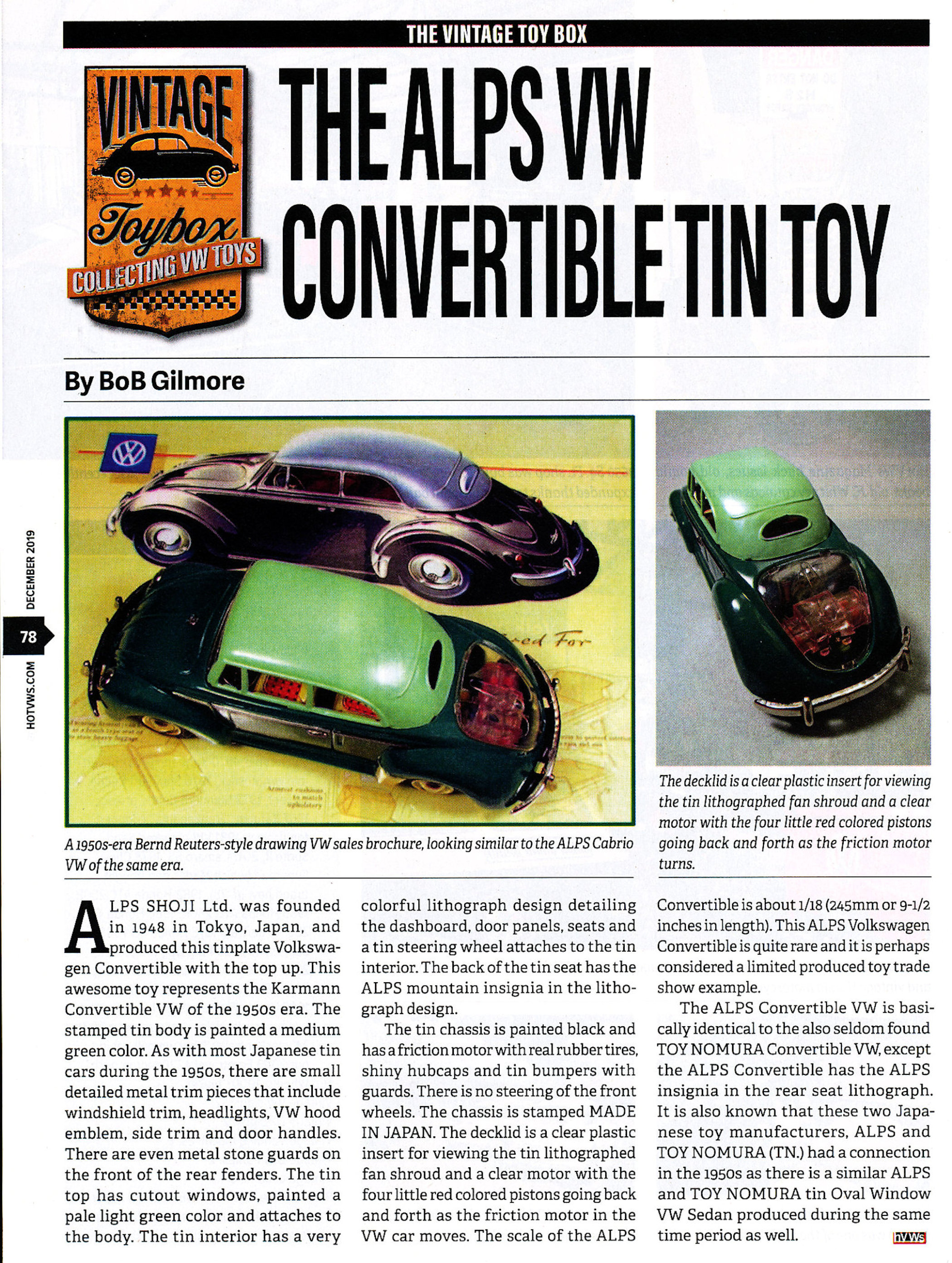 ALPS produced this very nice tin plate Volkswagen Convertible with the top up. Tin body is painted a medium green and there are metal trim pieces that include windshield trim, headlights, VW hood emblem, side trim and door handles.