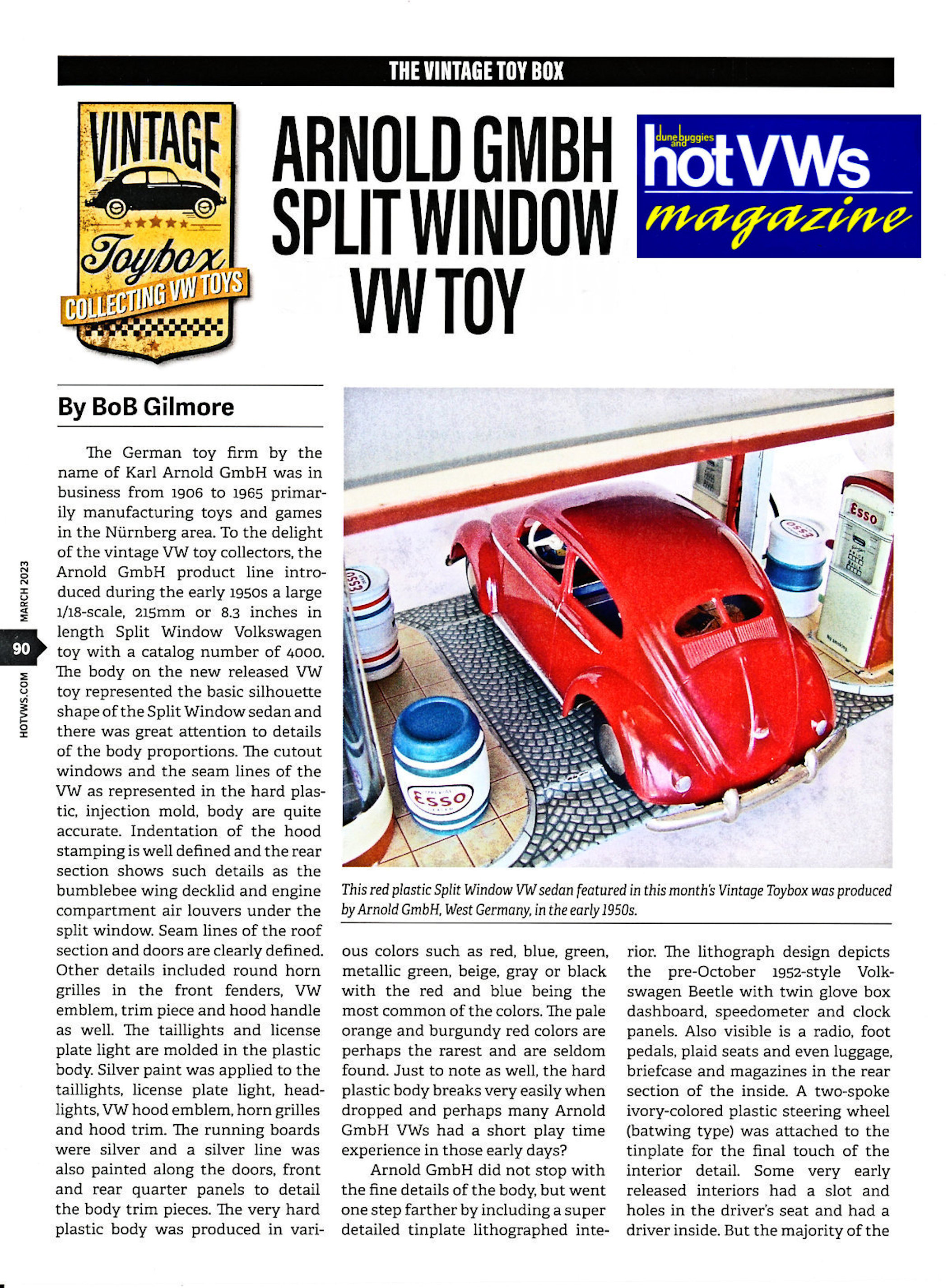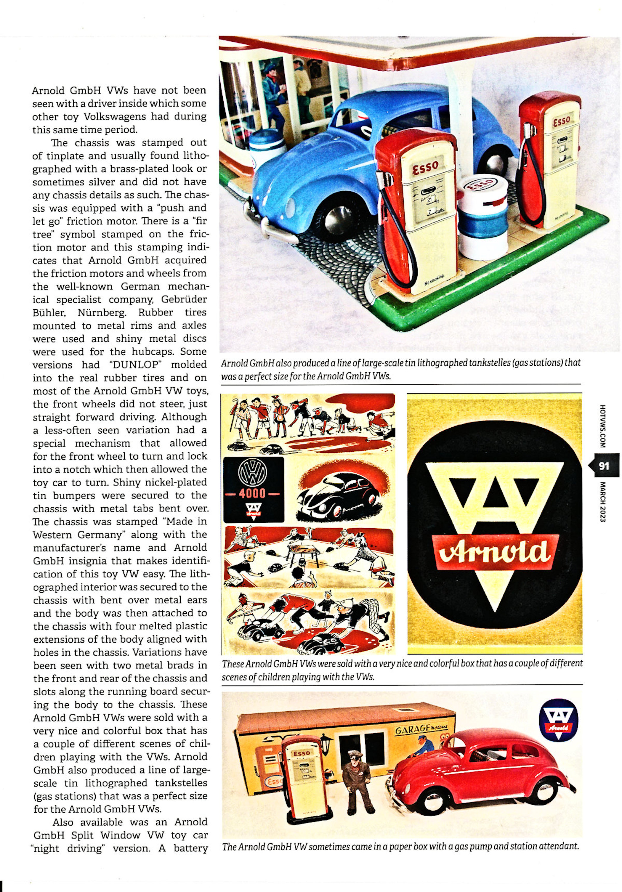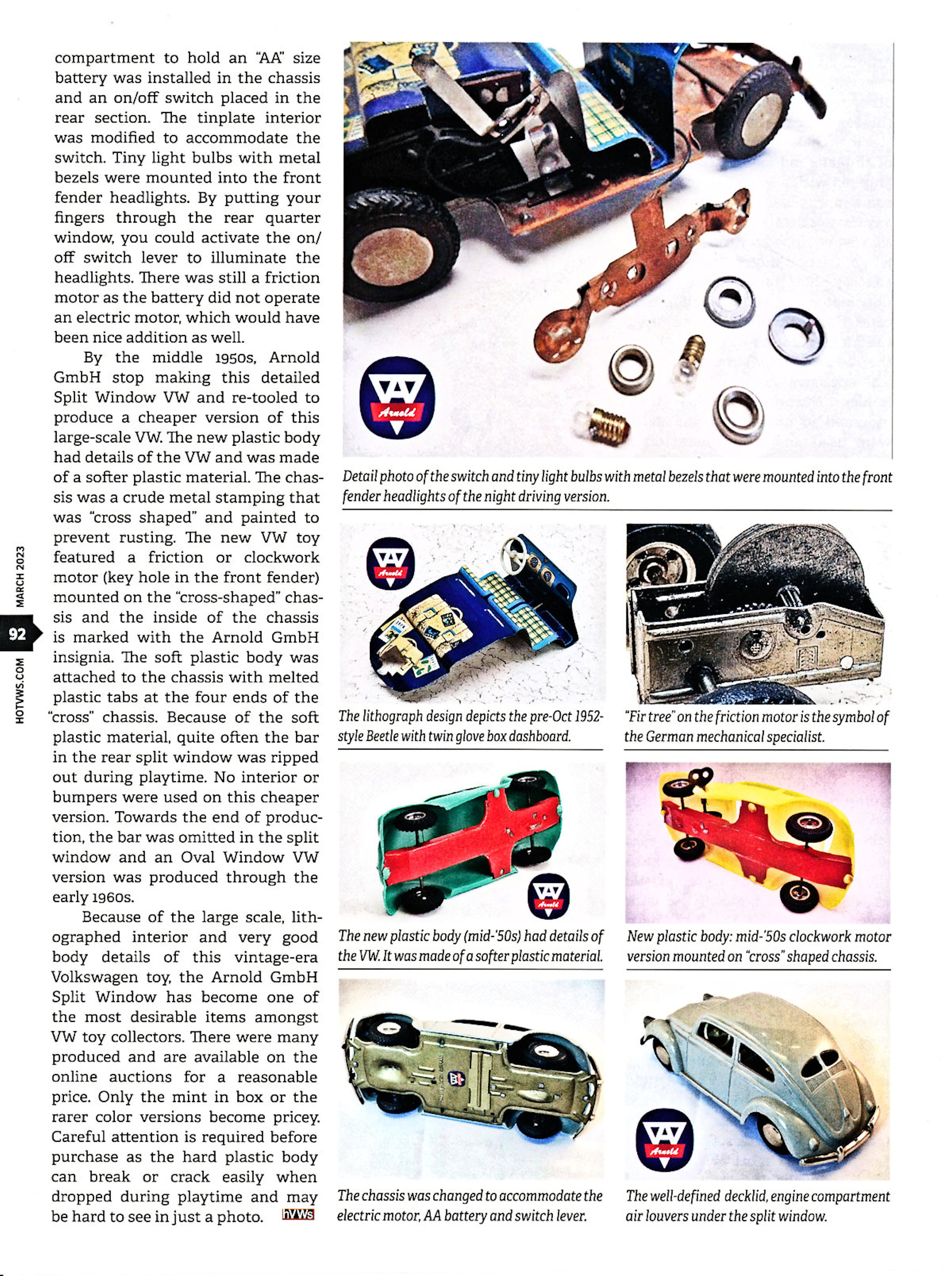 Arnold GmbH did not stop with the fine details of the body, but went one step farther by including a super detailed tin plate lithographed interior. The lithograph design depicts the pre-October 1952 style Volkswagen Beetle with twin glove box dashboard, speedometer and clock panels. Also visible is a radio, foot pedals, plaid seats and even luggage, brief case and magazines in the rear section of the inside.