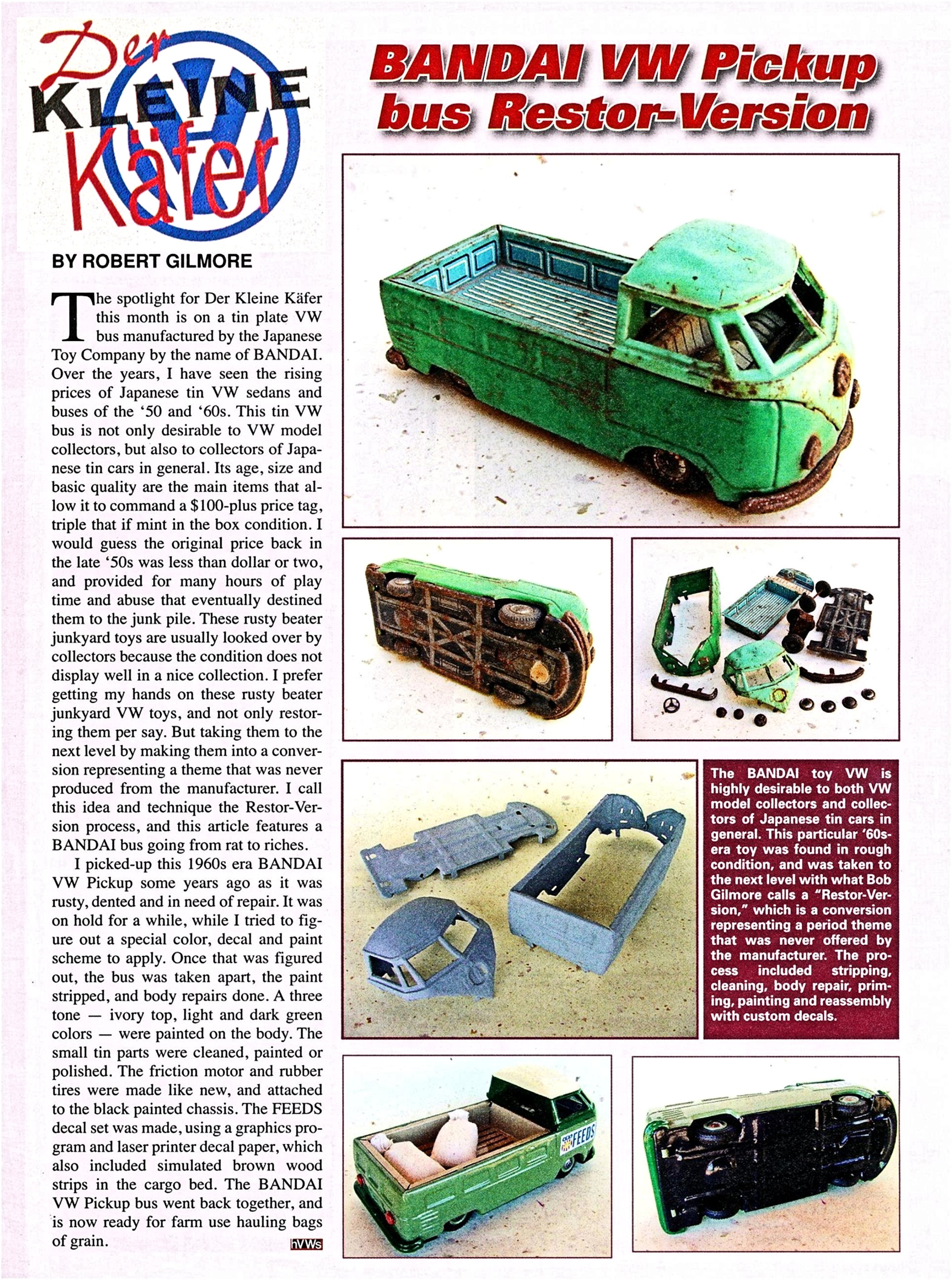 The BANDAI VW Bus was taken apart, sand blasted, body repairs done and painted. The small tin parts were cleaned, painted or polished. The friction motor and tires were made like new. Using a graphics program, decal paper and a color laser printer, the decals were made for the project. After the body was painted, the decals were applied, and a clear coat of paint was used to protect them.