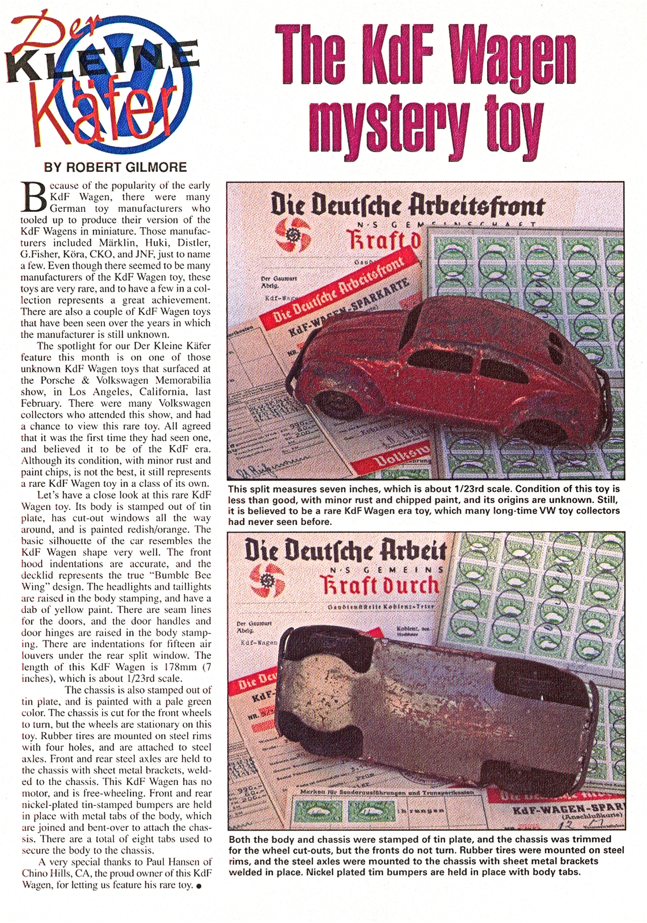 The Volkswagen KdF Wagen body is stamped out of tin plate and has cut out windows and the body is painted. Door seam lines and the headlights, taillights, door handles are raised in the body stamping. Indentations for fifteen air louvers under the rear split window.