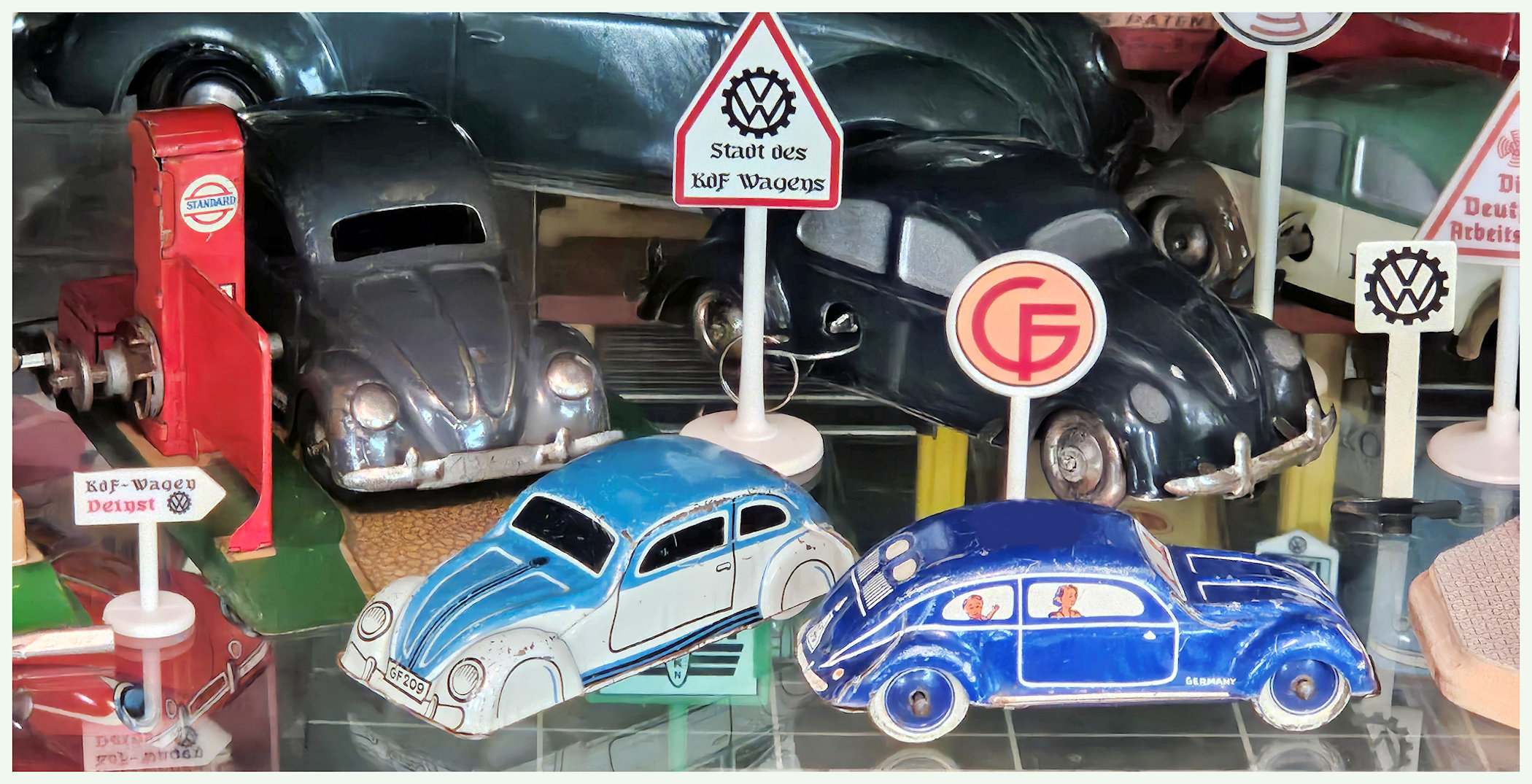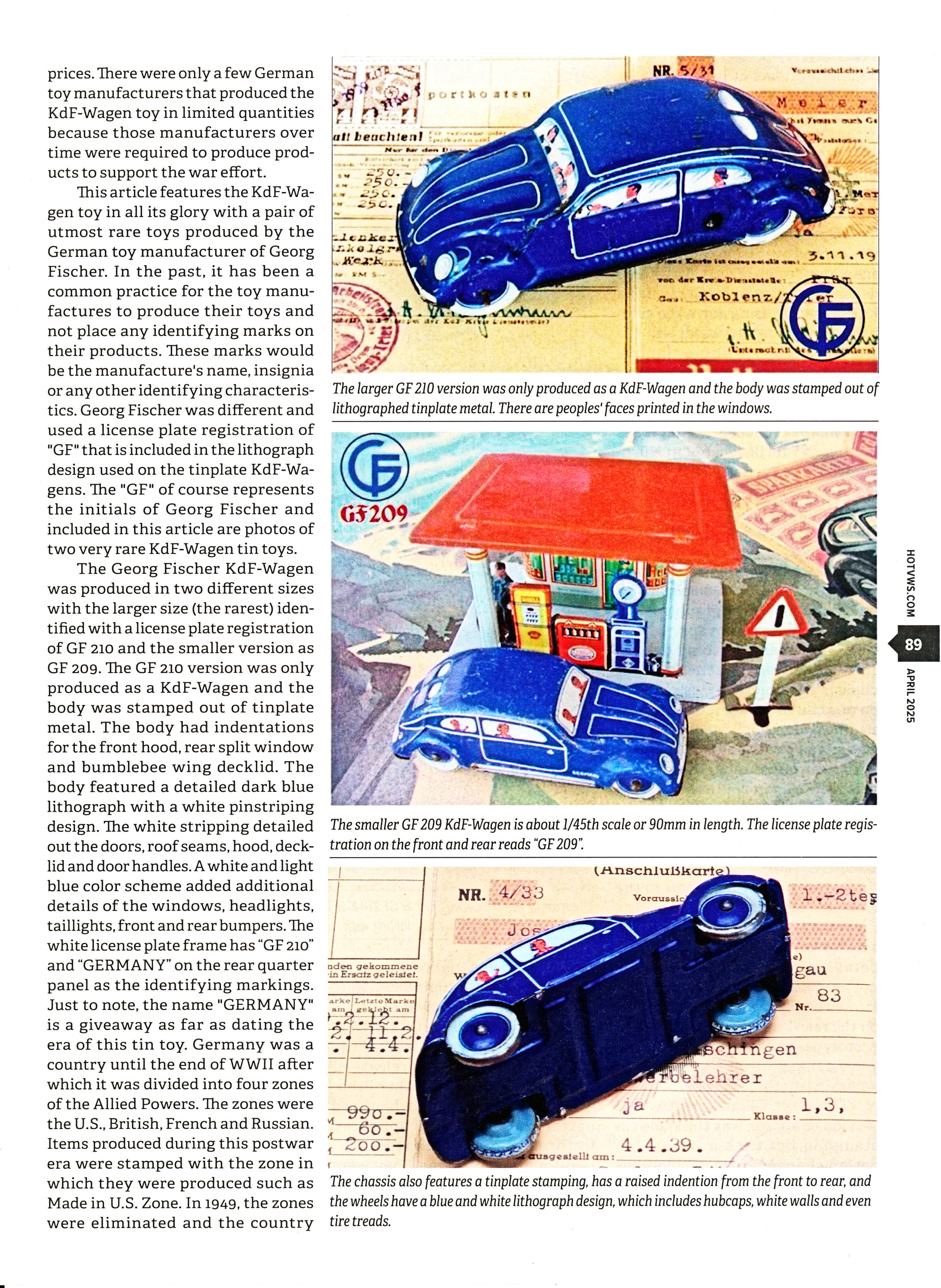 In the past, it has been a common practice for the toy manufactures to produce their toys and not place any identifying marks on their products. These marks would be the manufacture's name, insignia or any other identifying characteristics. Georg Fischer was different and used a license plate registration of "GF" that is included in the lithograph design used on the tin plate KdF Wagens.