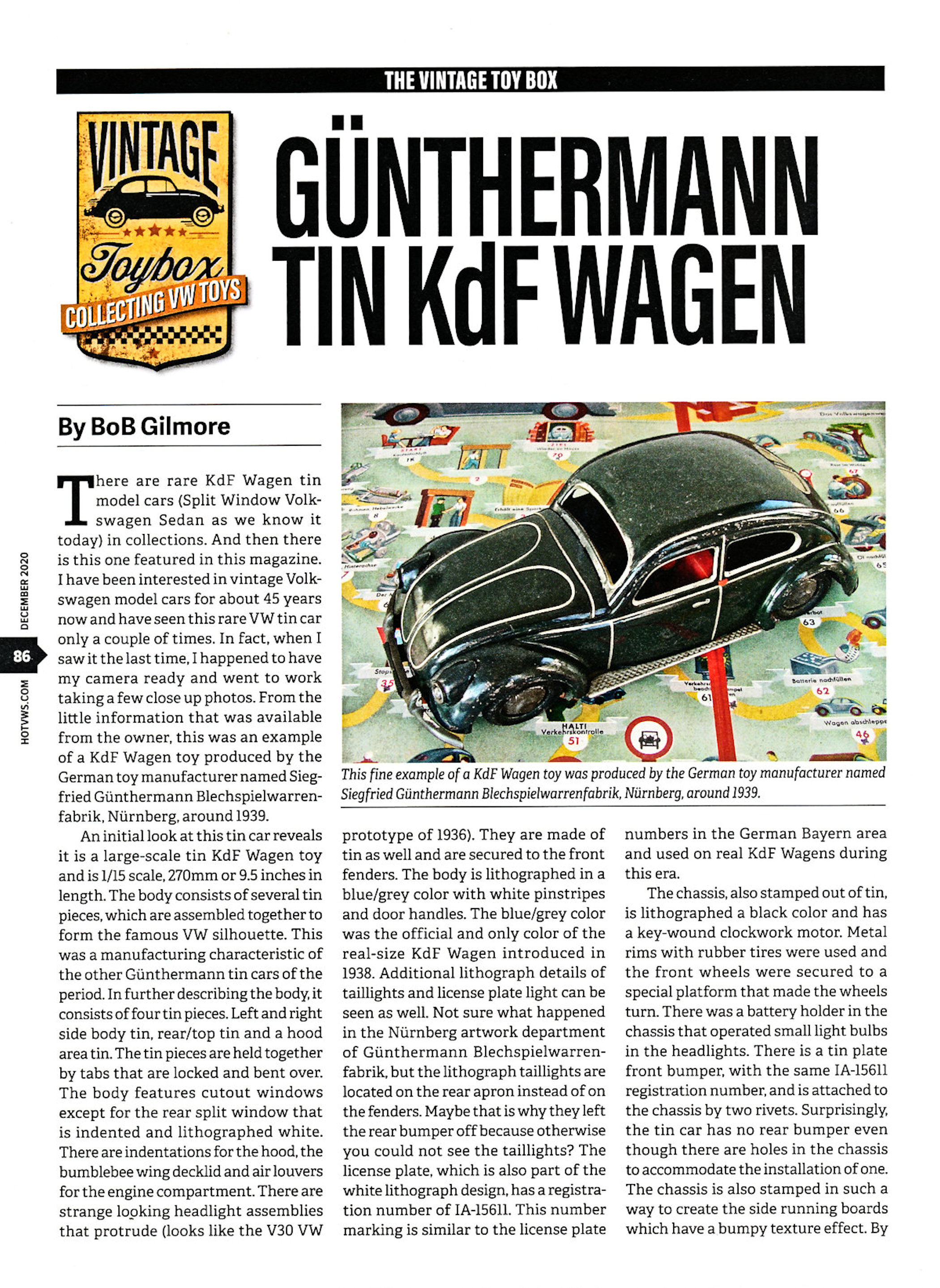 An initial look at this tin car reveals it is a large scale tin KdF Wagen toy and is 1/15 scale, 270mm or 9.5” in length. The body consists of several tin pieces, which are assembled together to form the famous VW silhouette. This was a manufacturing characteristic of the other Günthermann tin cars of the period.