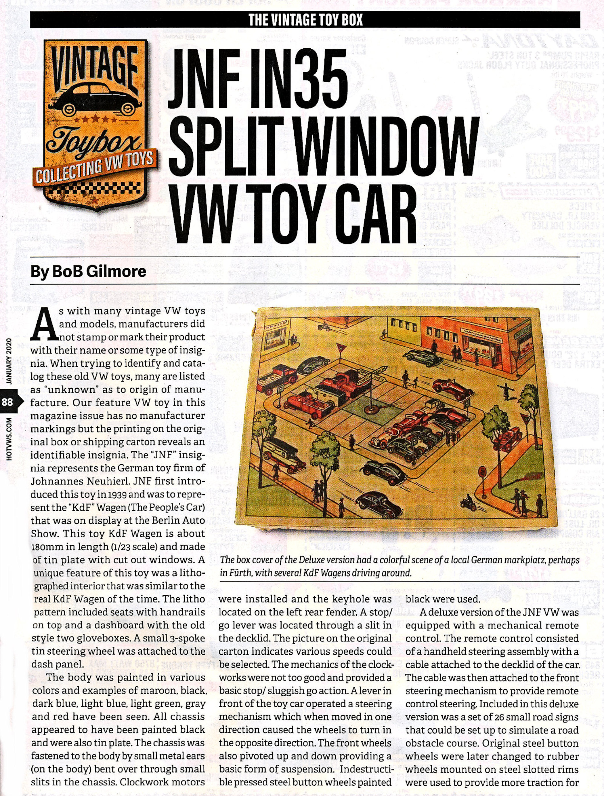 The VW toy in this magazine issue has no manufacturer markings but the printing on the original box or shipping carton reveals an identifiable insignia. The "JNF" insignia represents the German toy firm of Johnannes Neuhierl (JNF) founded in 1920 located in Fürth, Germany. The company name, JNF, is formed out of the first letters of his name and the town of Fürth.