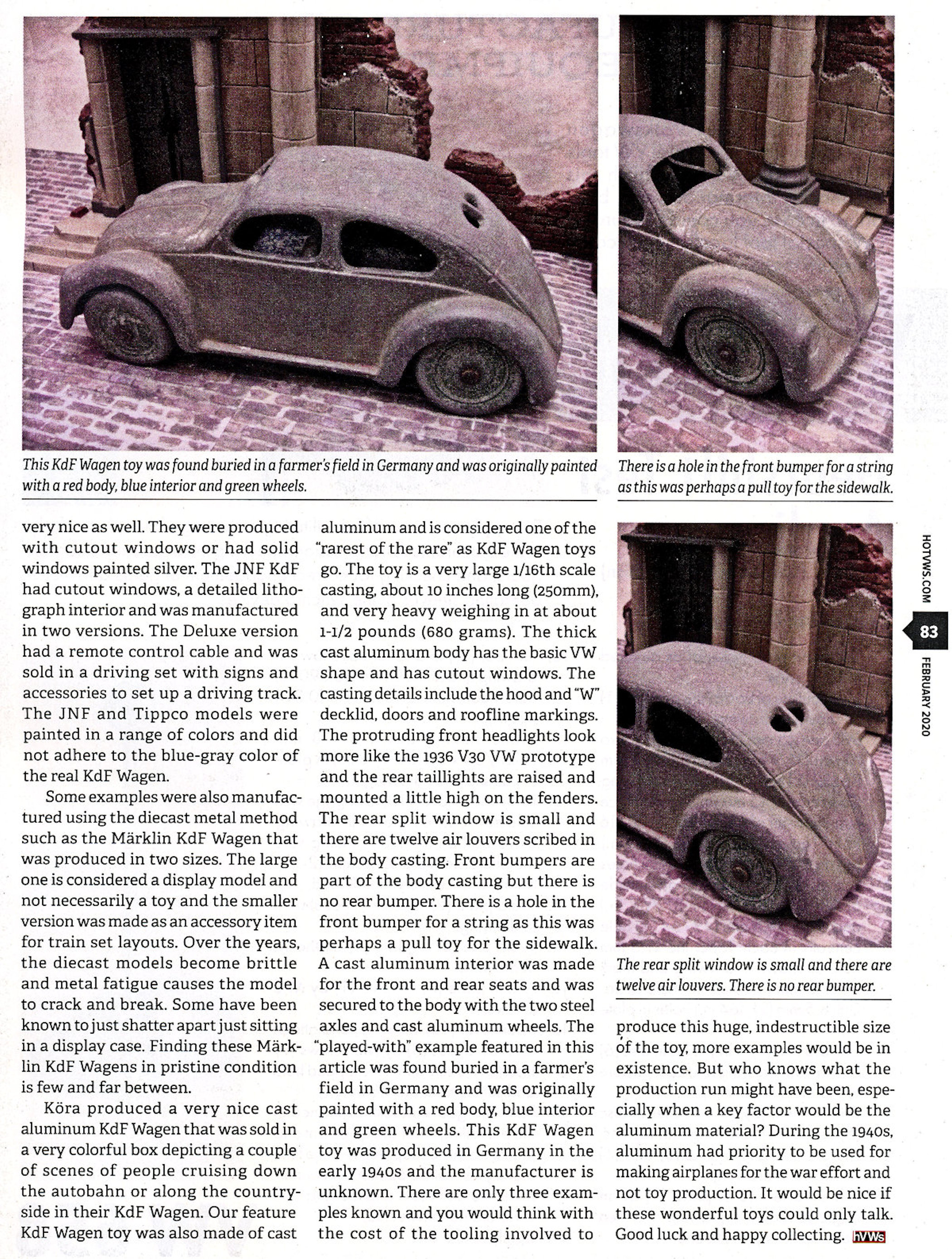This special, utmost rare, KdF Wagen toy was found by total accident! Way back in 1995, after a German farmer had plowed his field for the next crop. A very heavy rain storm came in that night. On the edge of his field, because of the heavy rain, there was something that had surfaced and looked like a metal object particularly standing out by the edge of the muddy field.