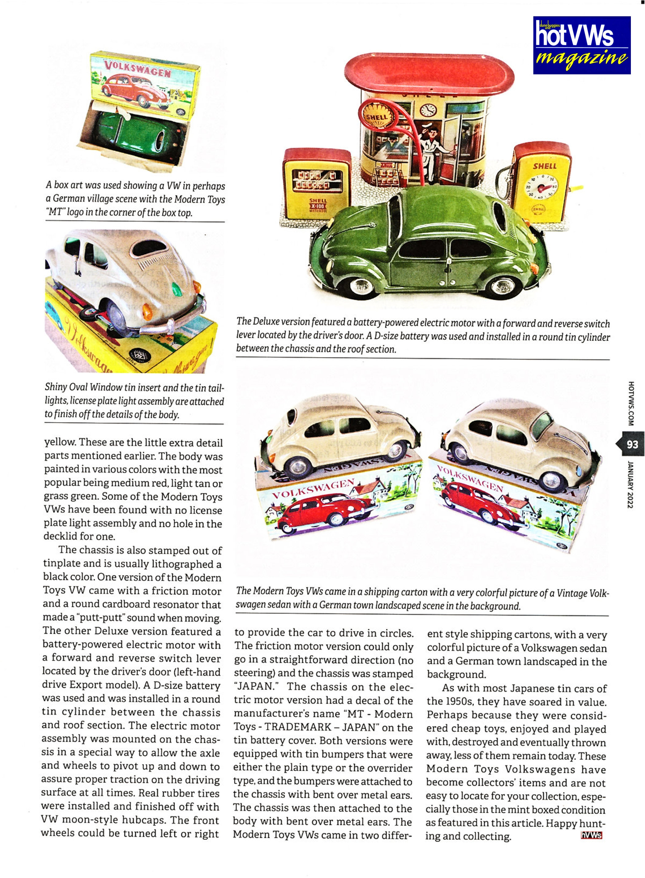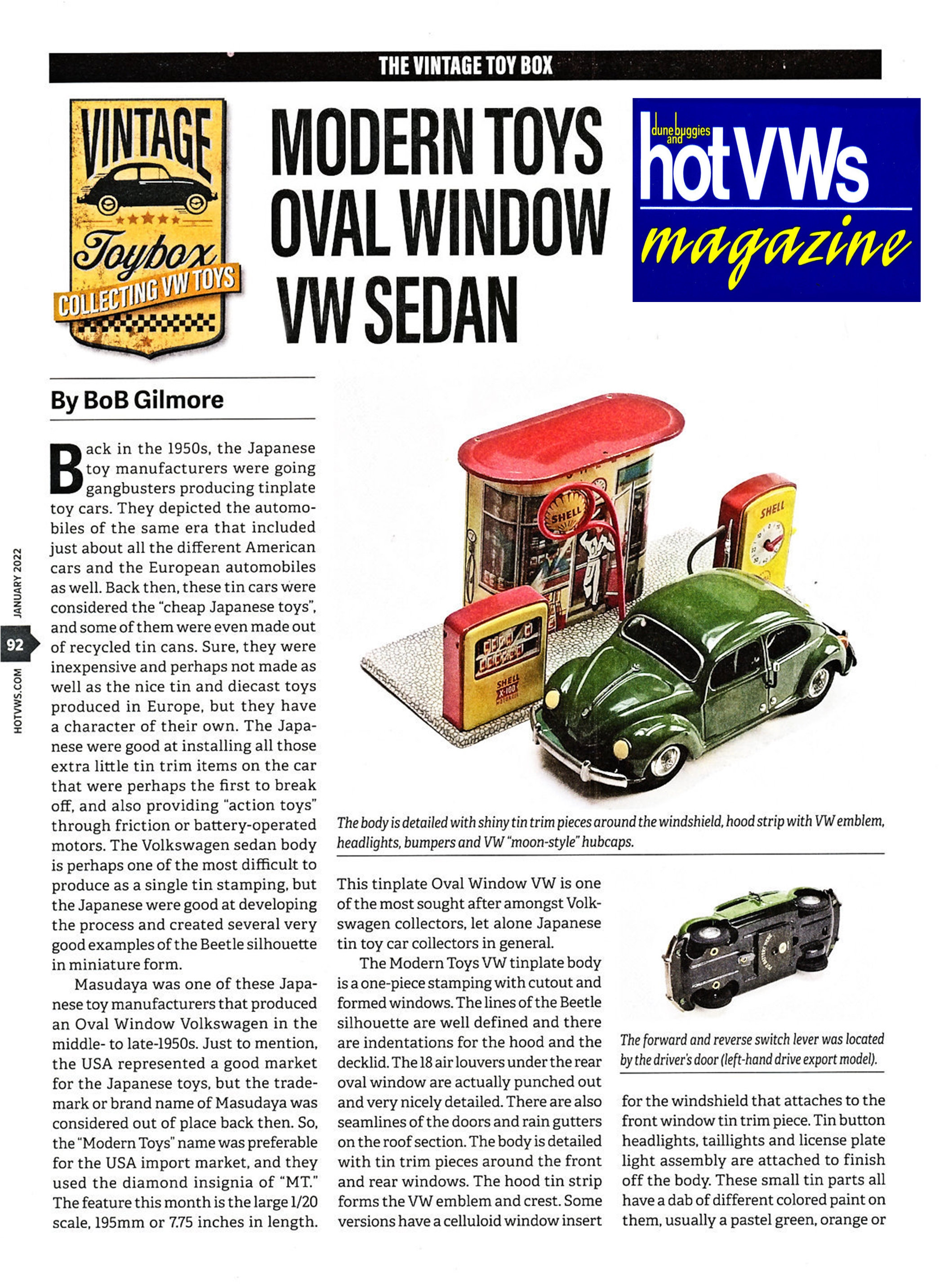 Masudaya was one of these Japanese toy manufacturers that produced an Oval Window Volkswagen in the middle to late 1950s era. Just to mention, the USA represented a good market for the Japanese toys produced but the trademark or brand name of Masudaya was considered out of place back then. So, the "Modern Toys" name was more preferable for the USA import market and they used the diamond insignia of "MT.” The feature this month is the large 1/20 scale, 195mm or 7.75 inches in length.