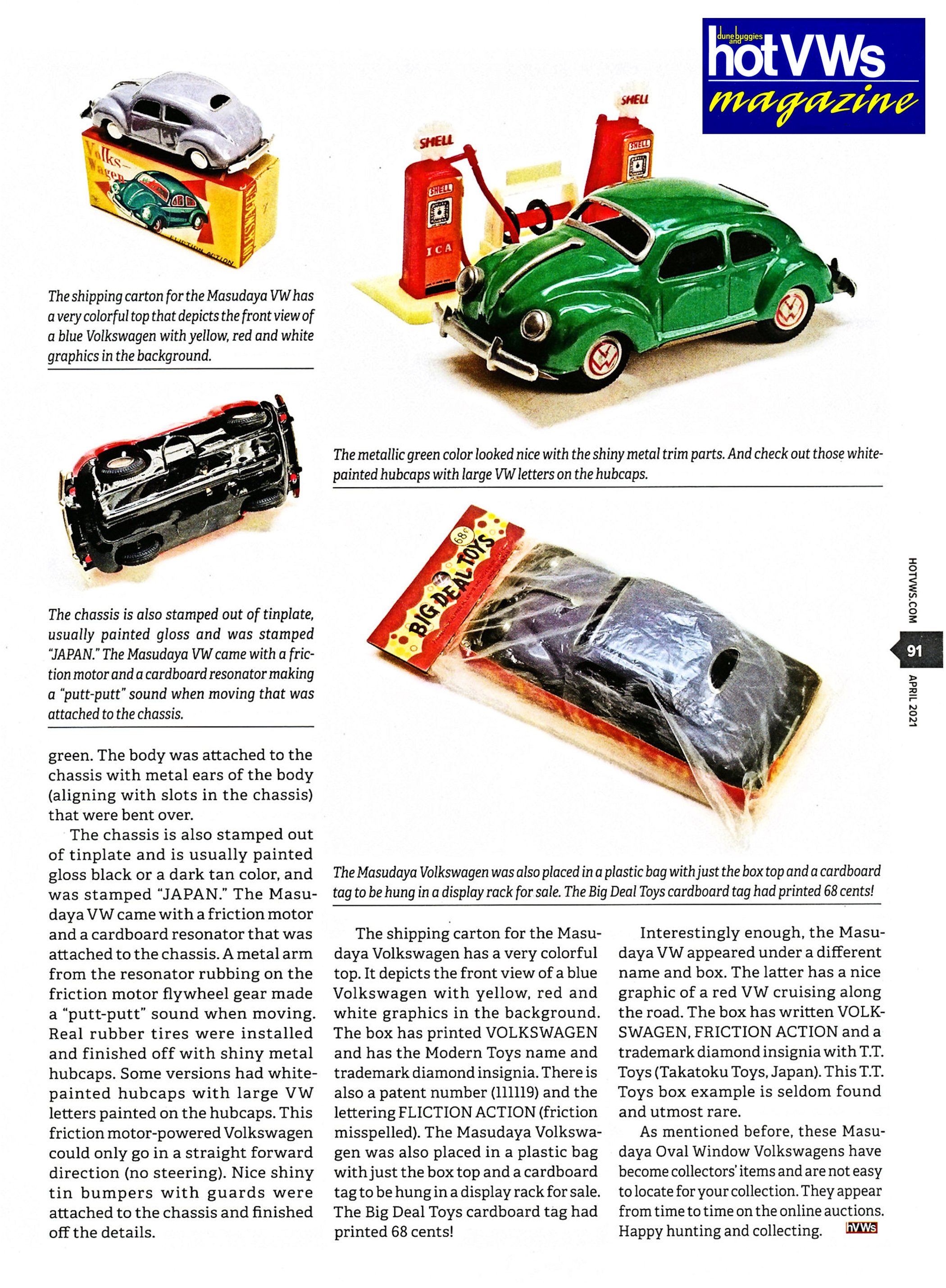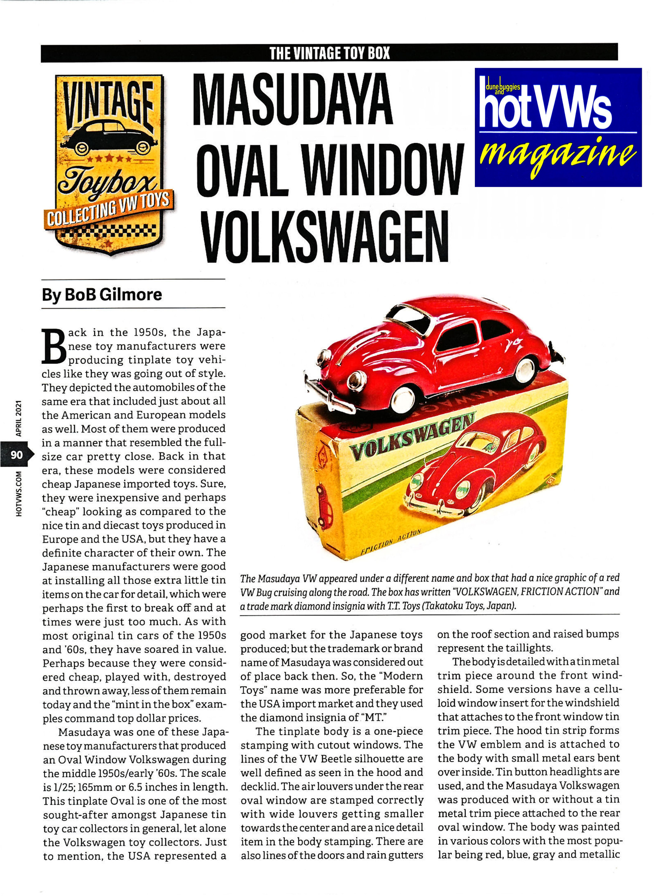 Masudaya or Modern Toys was one of these Japanese toy manufacturers that produced an Oval Window Volkswagen of the middle 1950s - early 1960s era. The scale is 1/25, 165mm or 6.5 inches in length. This tin plate Oval Window VW from Masudaya is one of the most sought after amongst Japanese tin toy car collectors in general, let alone the Volkswagen toy collectors.
