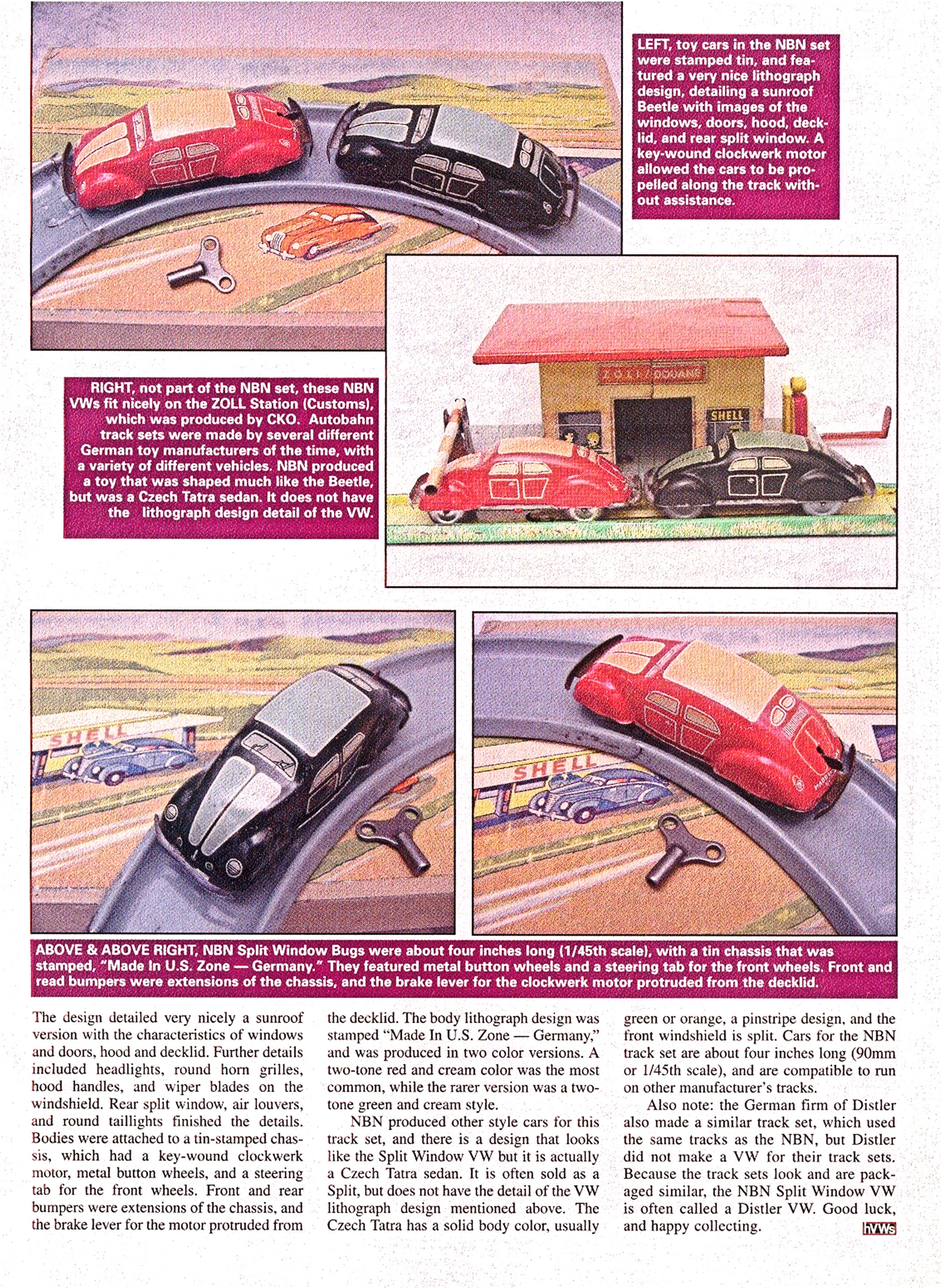 The tin Split Window VW Sedan toys were produced as a single toy to play with which featured a long running clockwerk motor and some had front wheel steering for driving in large loops. Several manufacturers produced an autobahn track set which could be set up and those track cars would follow the roads of the track set.