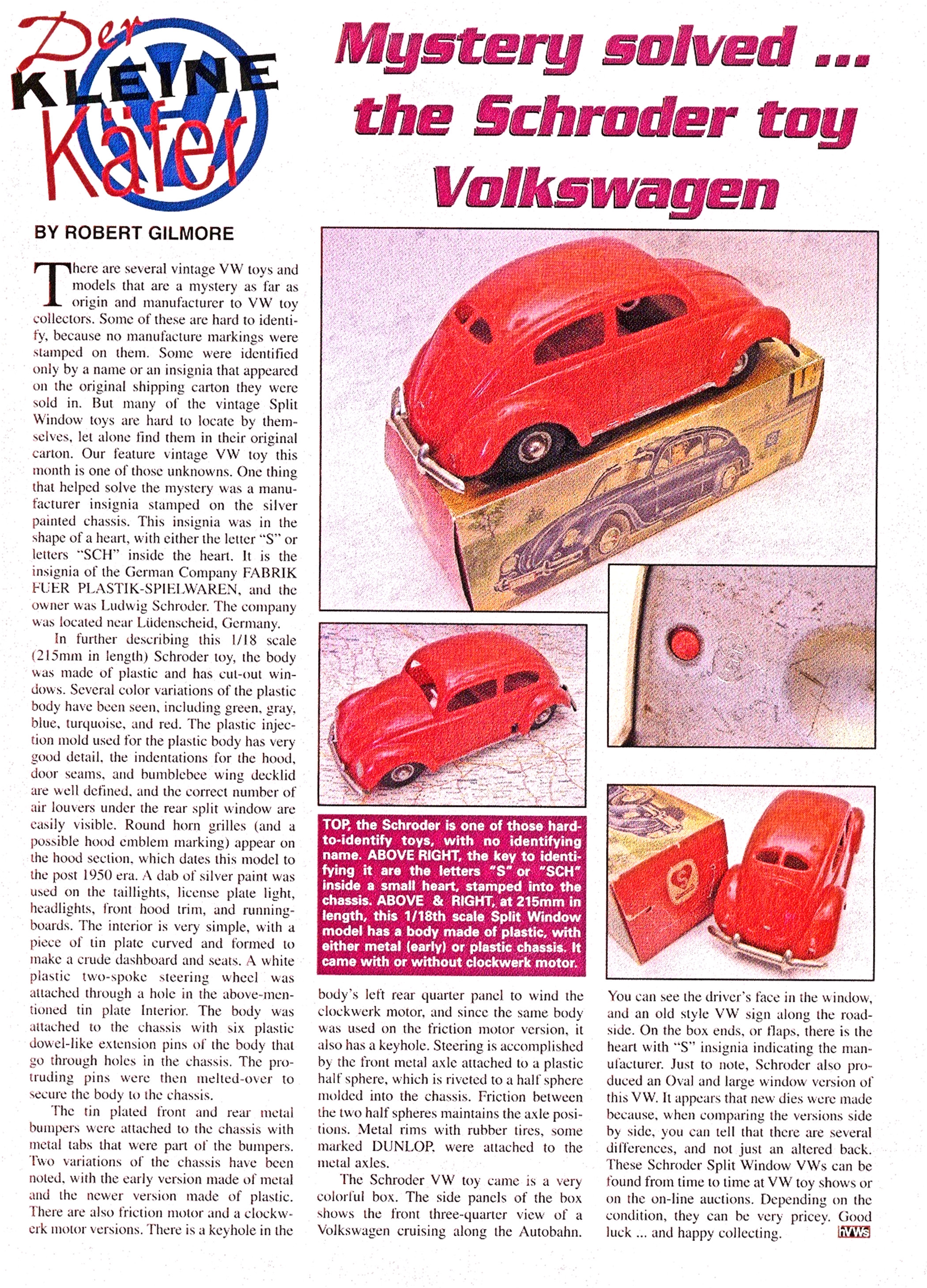 In further describing this 1/18 scale (215mm in length) SCHRÖDER VW toy, the body is made of hard plastic and has cut out windows. Several color variations of the plastic body have been seen. They are green, gray, blue, turquoise and red to name a few. The plastic injection mold used for the plastic body has very good details.