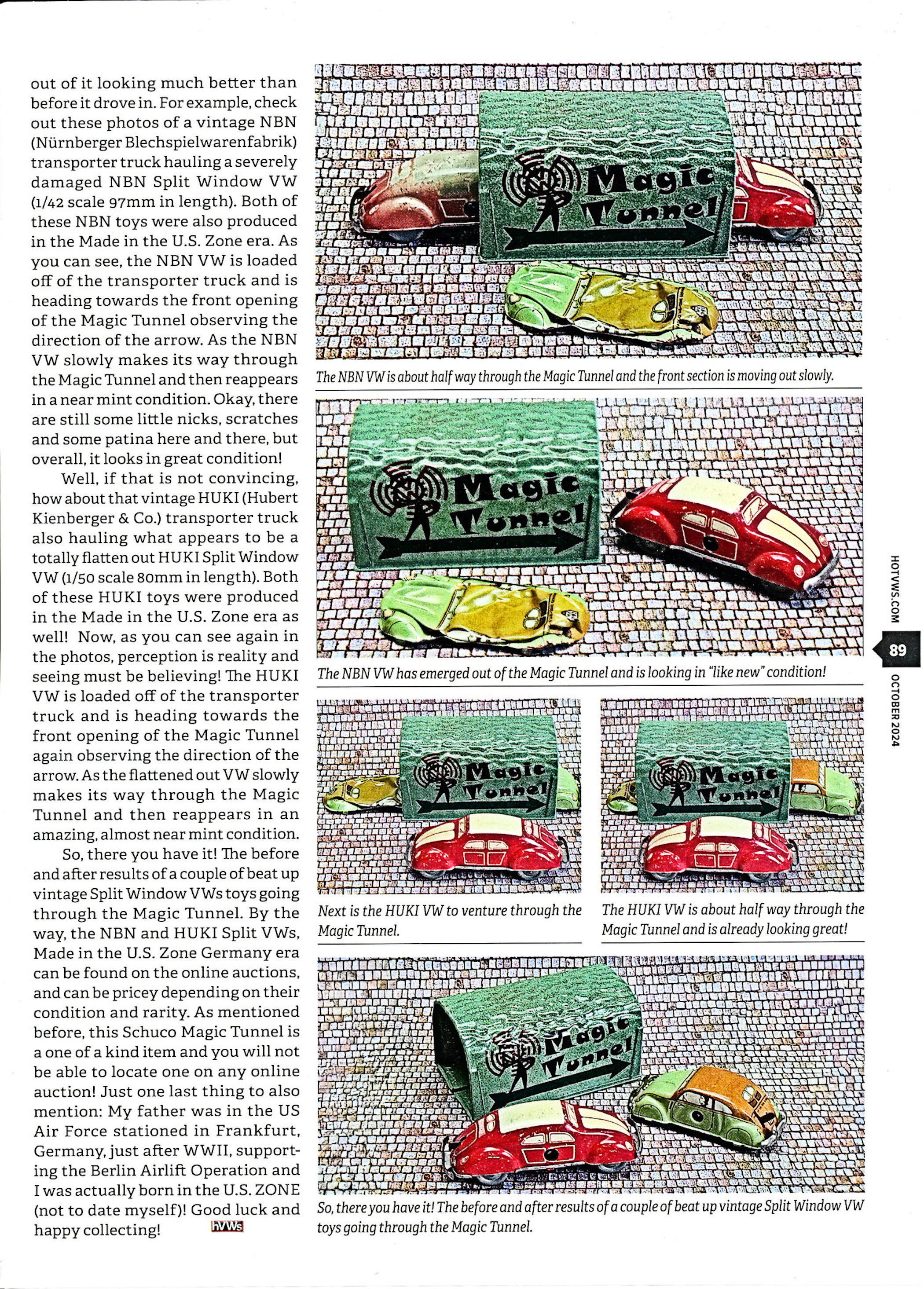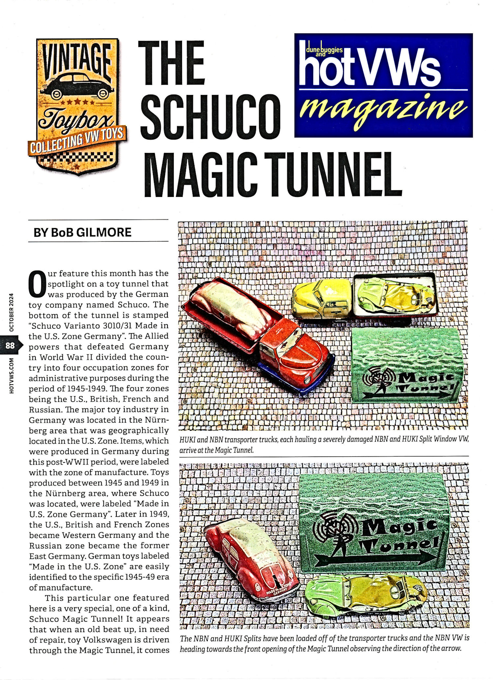 This particular one featured here is a very special, one of a kind, Schuco Magic Tunnel! It appears that when an old beat up, in need of repair, toy Volkswagen is driven through the Magic Tunnel, it comes out of the Magic Tunnel looking much better than before it drove in. For example, check out these photos of a vintage NBN (Nürnberger Blechspielwarenfabrik) transporter truck hauling a severely damaged NBN Split Window VW (1/42 scale 97mm in length).