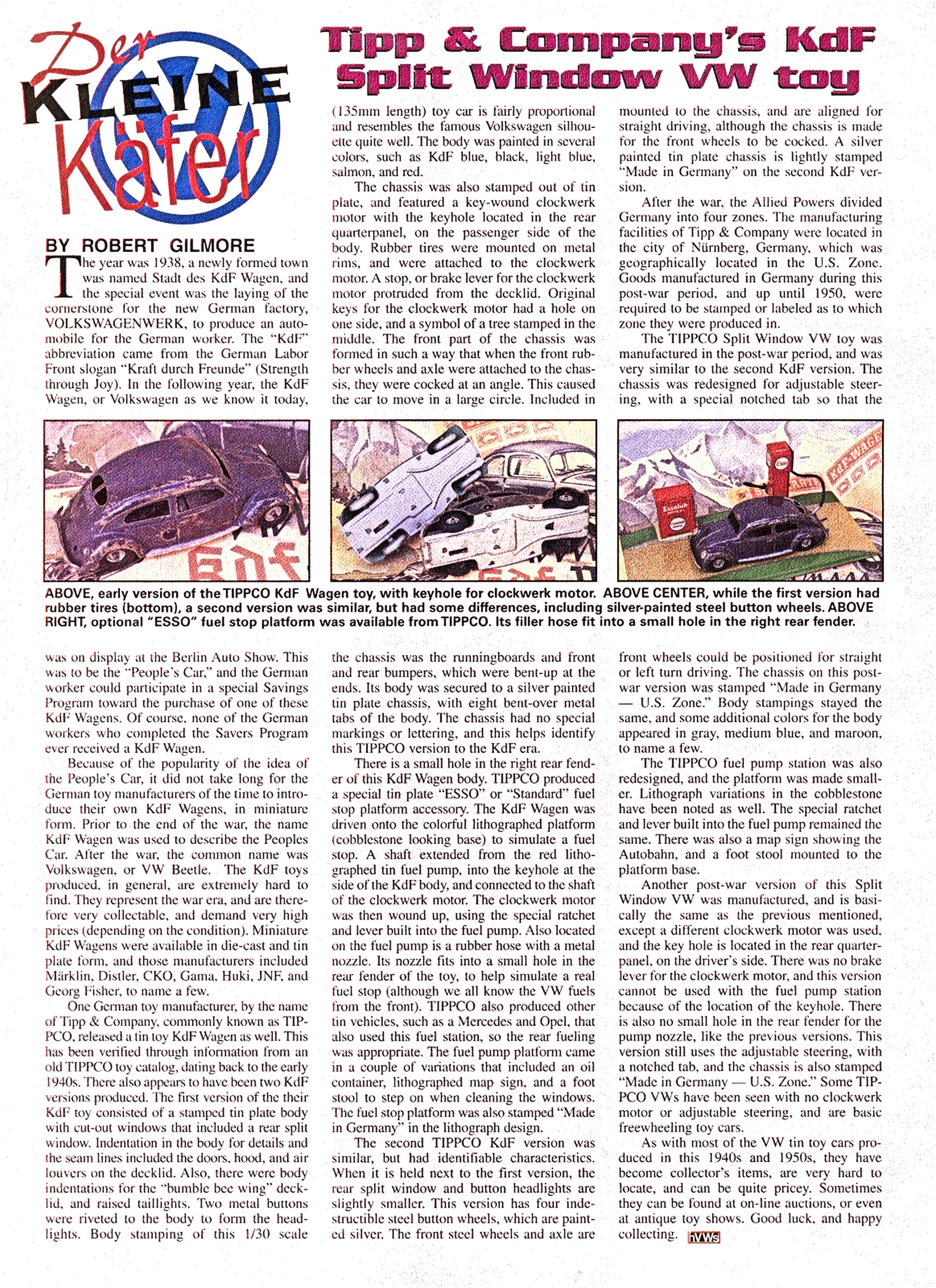 Nice stamping of a KdF Wagen VW tinplate body with cut out windows, door seams, tin button headlights and indented air louvers. Clockwork motor with rubber tires (early release) or metal wheels (later release) with keyhole on passenger side. Tin plate chassis with or without “GERMANY” stamping.