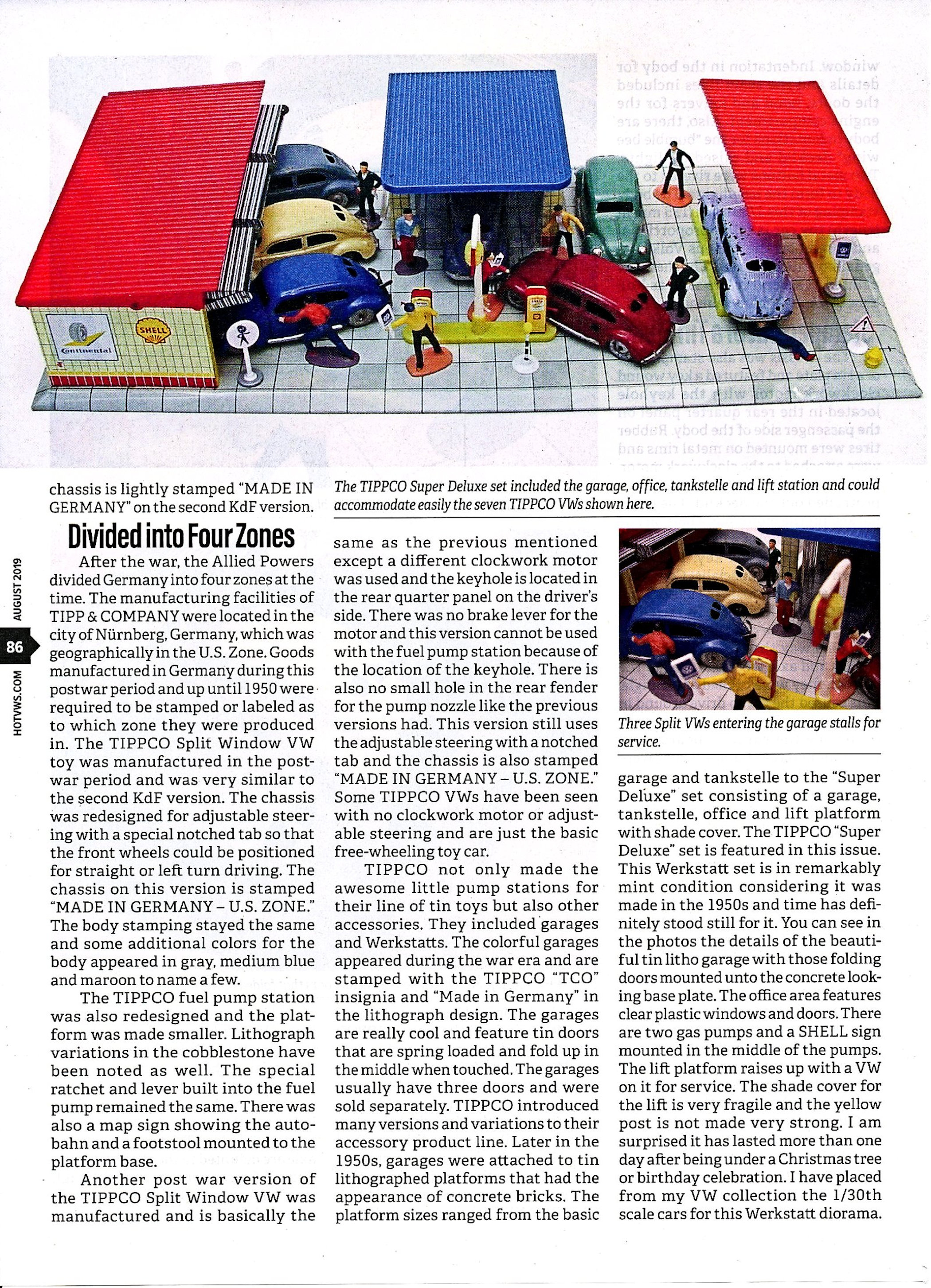 The platform sizes ranged from the basic garage and tankstelle to the “Super Deluxe” set consisting of a garage, tankstelle, office and lift platform with shade cover. The Tipp&Co “Super Deluxe” set is featured in this issue. This werkstatt & garage set is in remarkably mint condition considering it was made in the early 1950s and time has definitely stood still for it.