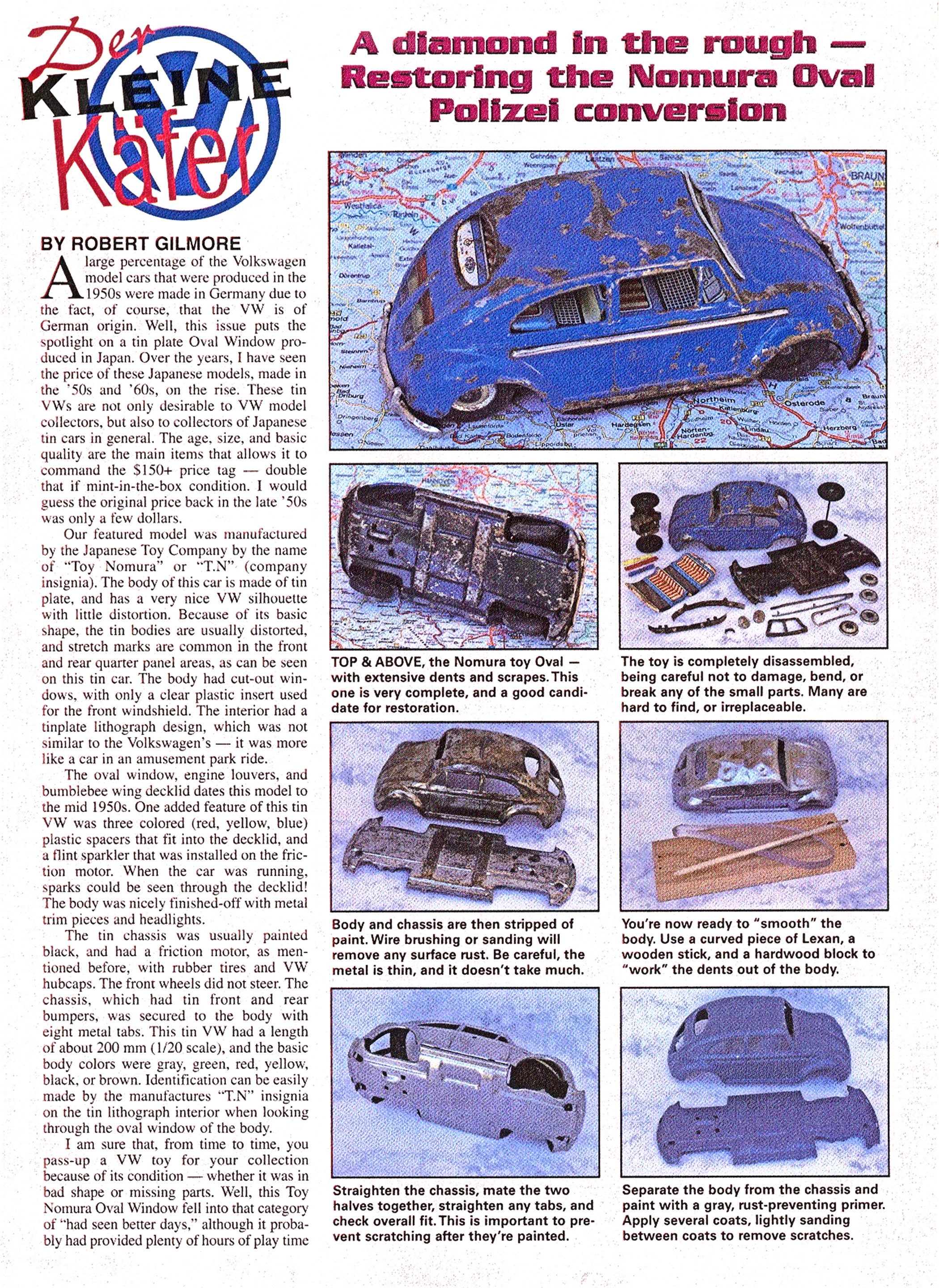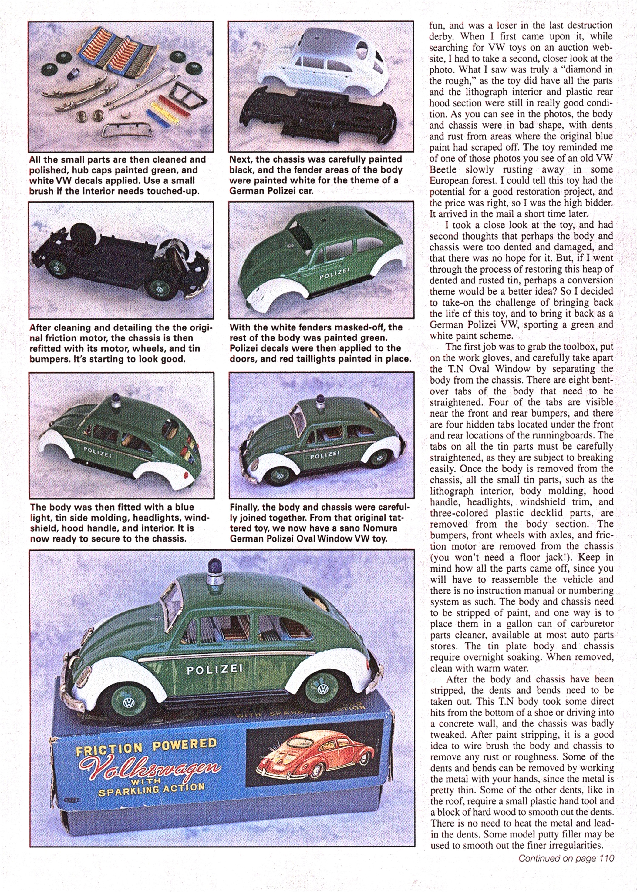 This TOY NOMURA T.N TN Oval Window VW was found on an online auction and was in very bad condition. The body and chassis was taken apart and the process of smoothing out the dents, paint striping, cleaning and figuring out what is the best way to handle the condition of some of the parts. The theme for this Vintage Oval Window VW was to transform it into a German POLIZEI vehicle.