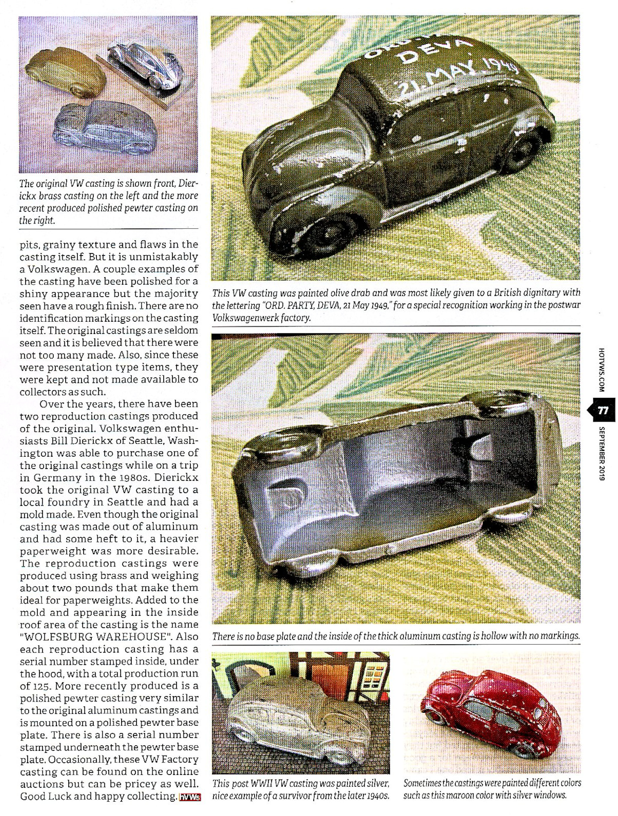 During this post WWII time period, Volkswagenwerk was also producing VWs in miniature that were mold casted out of aluminum. As the story goes, the original castings were made by the German factory workers and were used as a special presentation type item within the factory itself.
