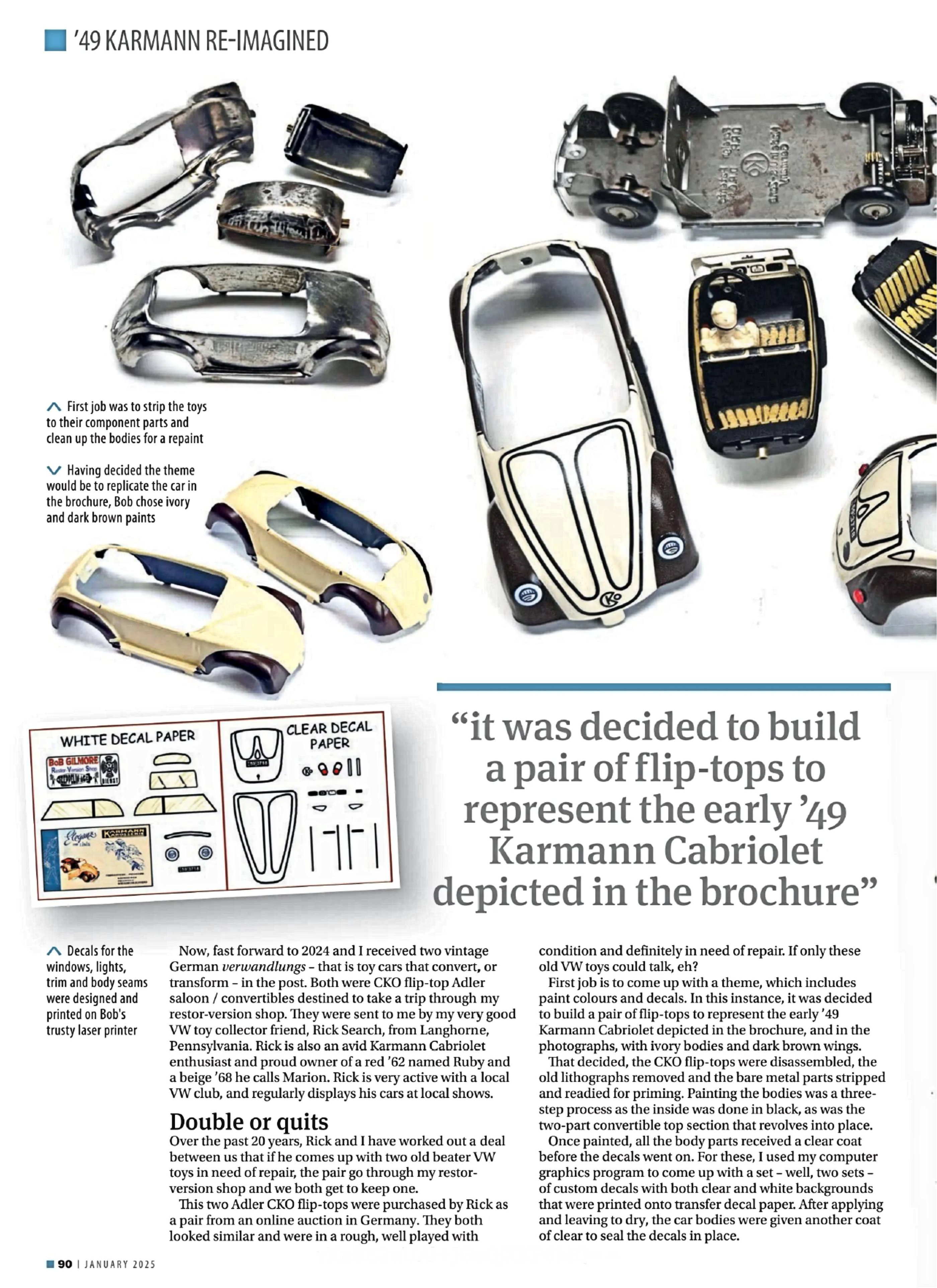 The article has a great story line along with the conversion of the two vintage CKO flip top VW toys to match the Karmann prototype.