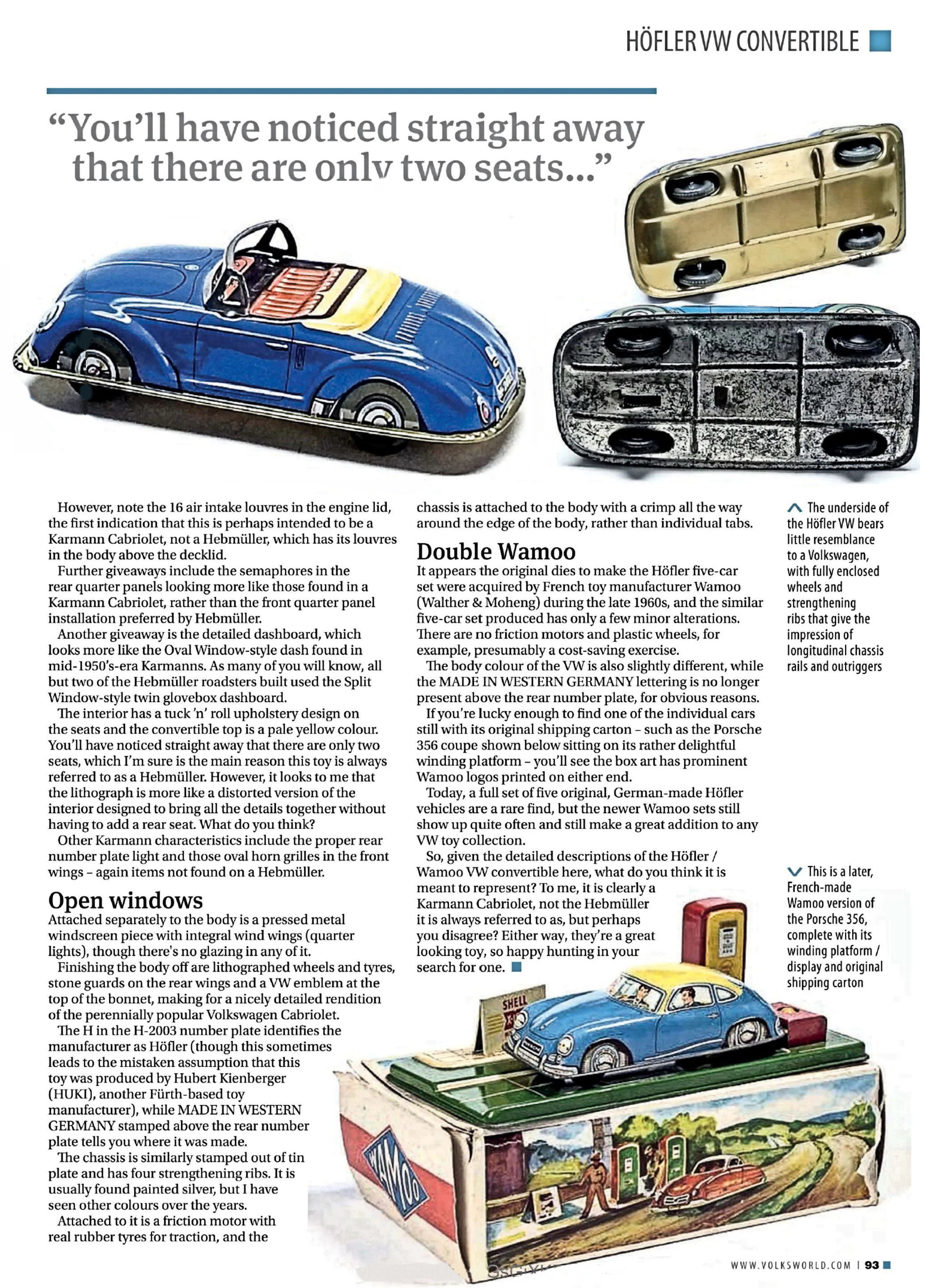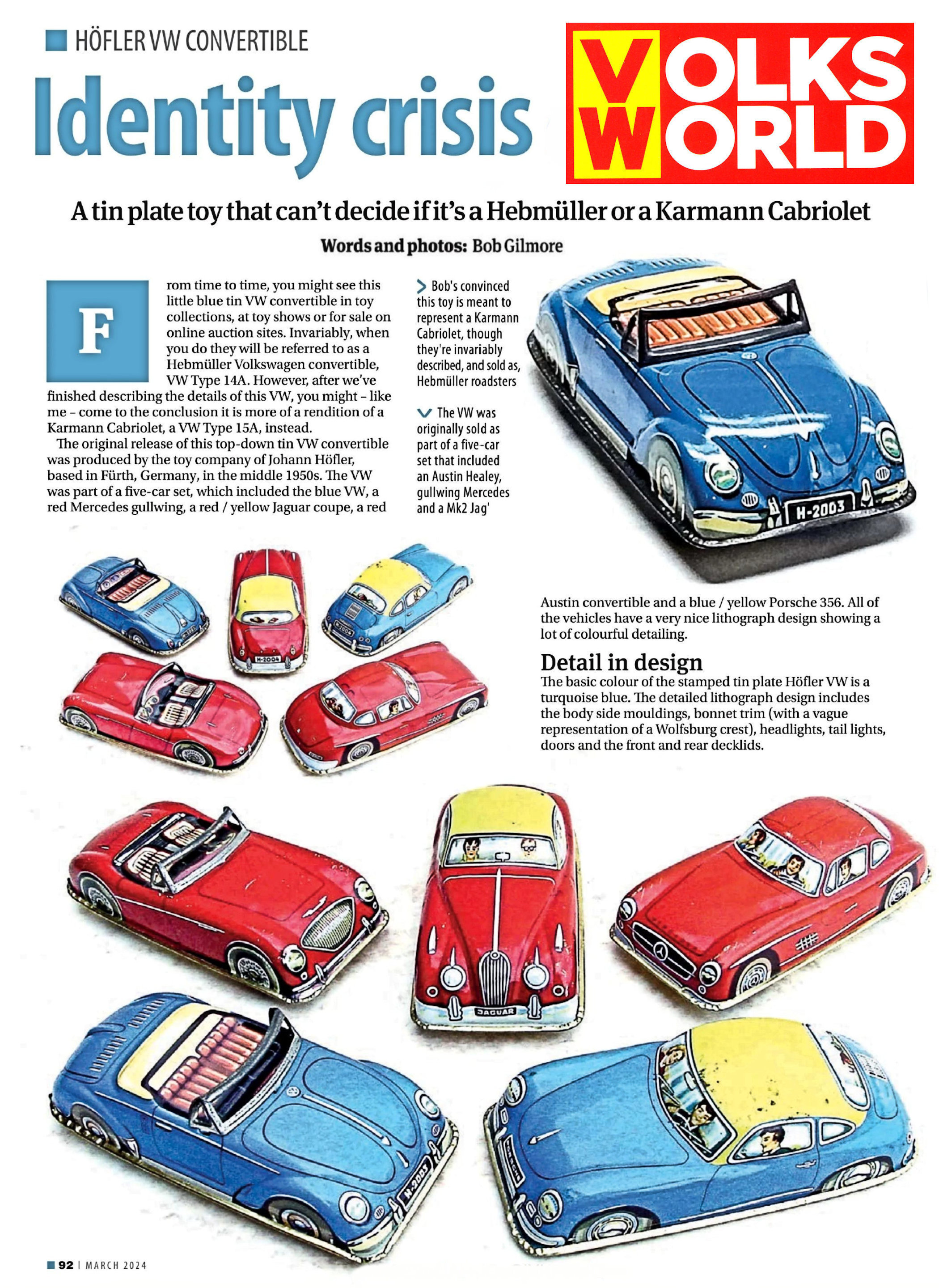 The original release of this top down tin VW Convertible toy was produced by the toy company by the name of Johann Höfler, Fürth, Germany, in the middle 1950s.