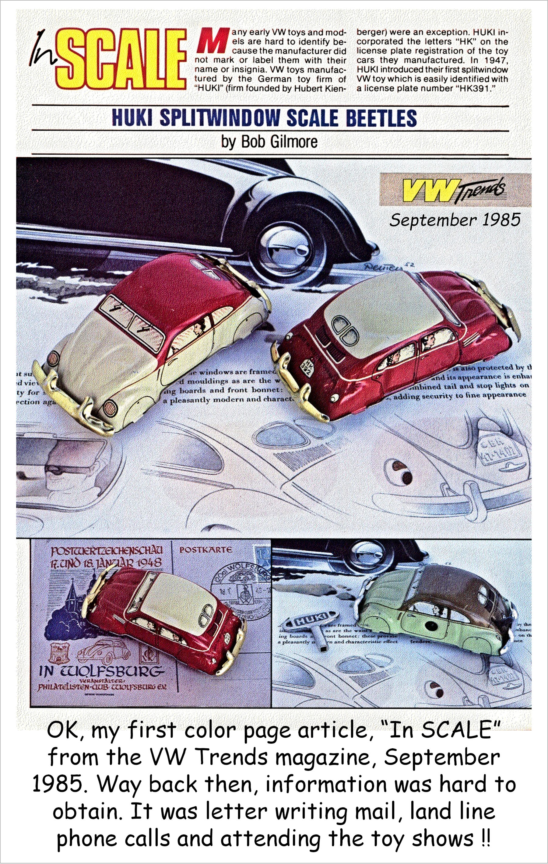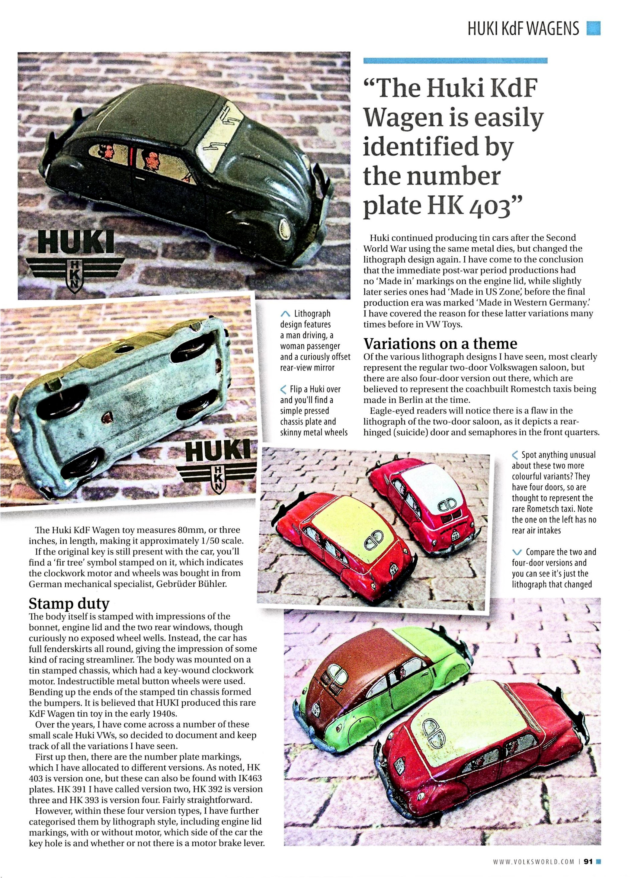 One of my favorite small scale tin lithographed vintage VW toys from HUKI, Germany. It has taken years of finding information about all the variations of these awesome little Split Window VWs toys. As usual, the editor, Paul Knight, did a very nice layout for the photos and his little spin on the text for the article.