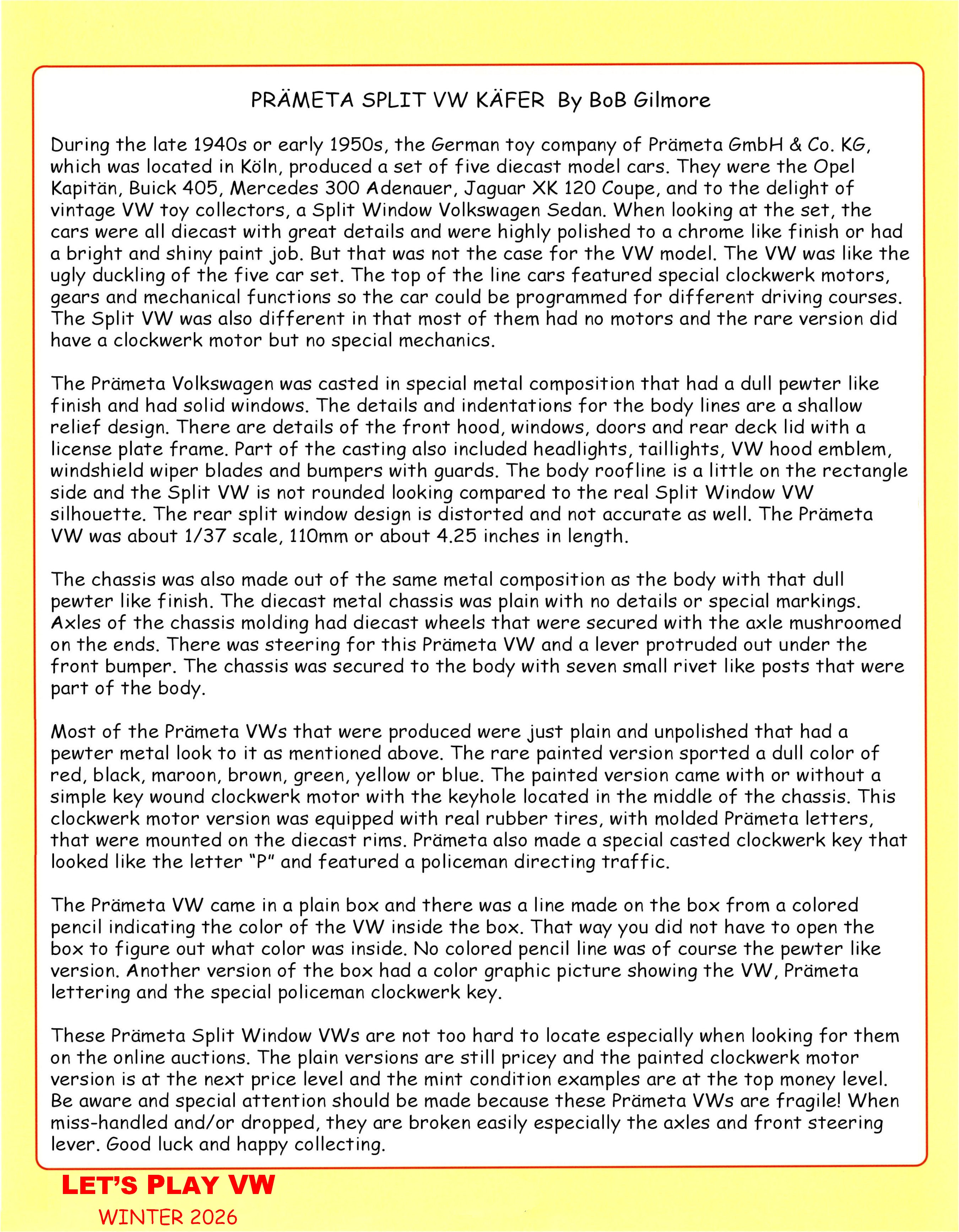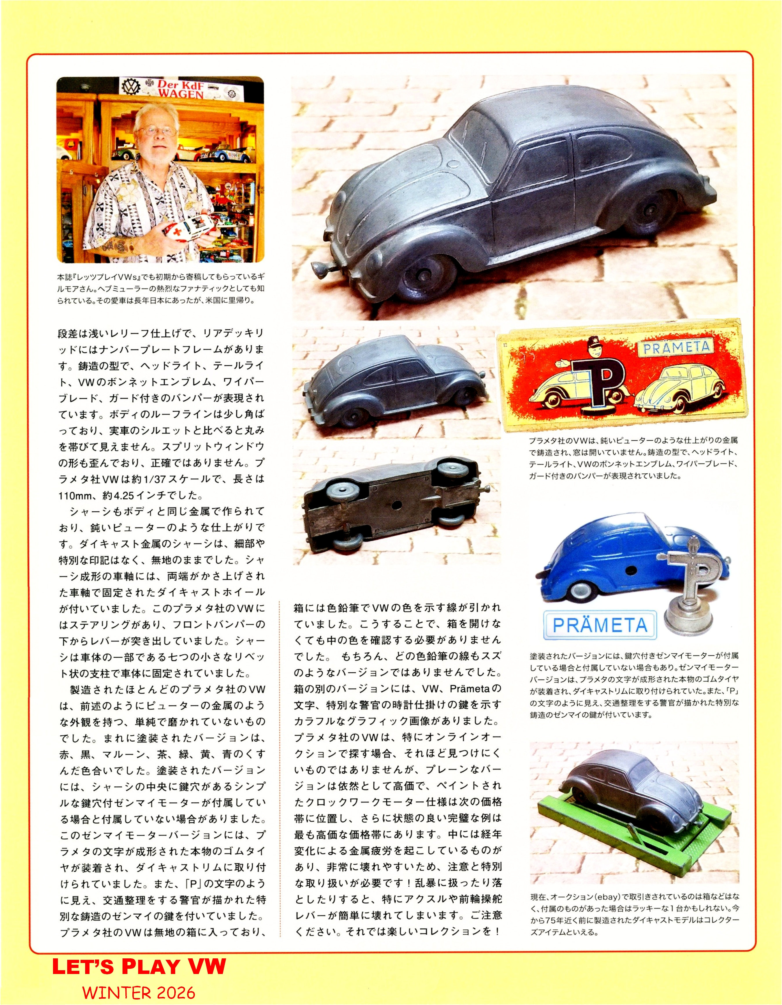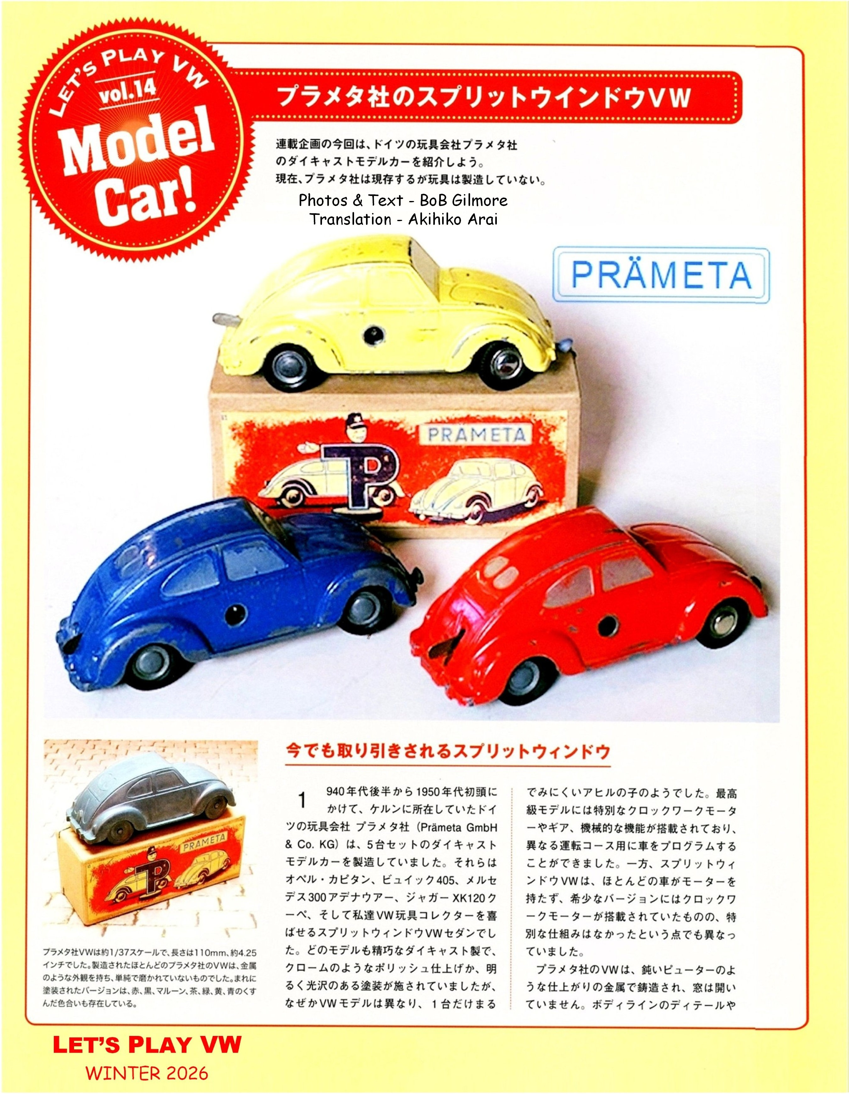 Greetings !! Here is the latest issue of LET'S PLAY VW magazine article featuring the Vintage PRÄMETA Split Window VW toy !! Some nice photos and magazine layout !! Now is a good time for you to practice your Japanese language !! OK, if you are having a little trouble understanding, I read and translated the article for you, see page three !! Check it out !!