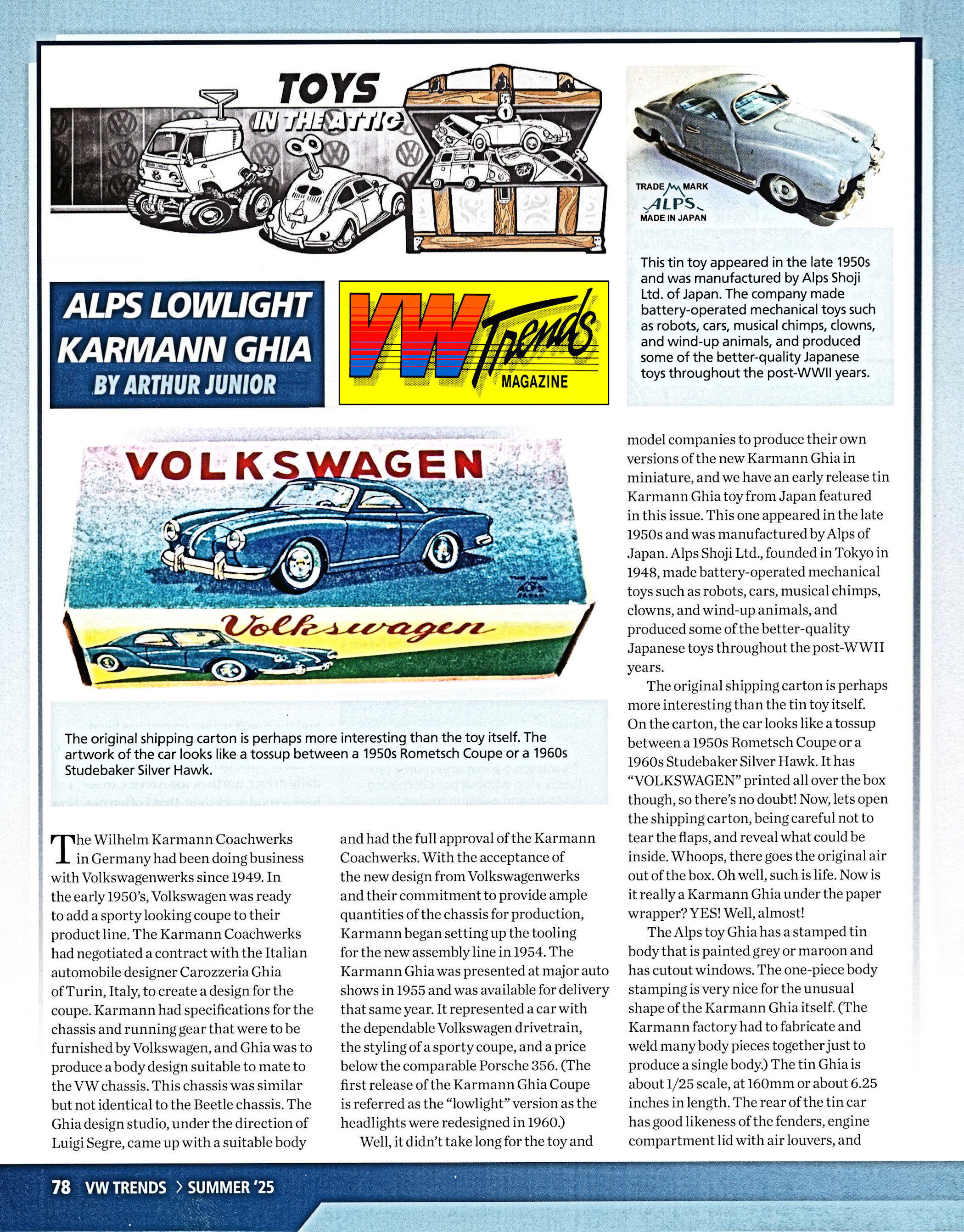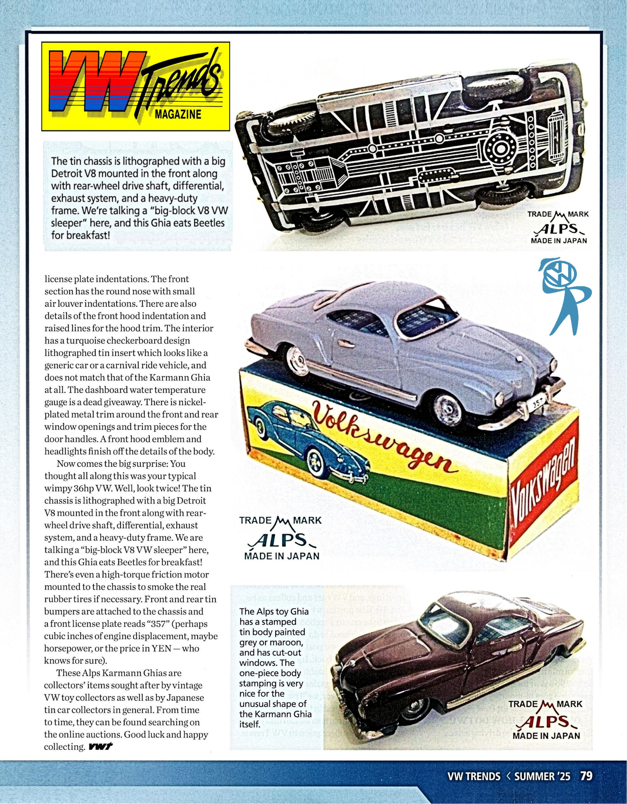 The Volkswagen Karmann Ghia was presented at major auto shows in 1955 and was also available for delivery in that same year. This Karmann Ghia Coupe would represent a car with the proven dependable Volkswagen drive train and the styling of a sporty Coupe and be priced below the comparable Porsche 356 of the time. Well it did not take long for the toy and model companies to produce their version of the new VW Karmann Ghia in miniature and we have an early release tin Karmann Ghia toy from Japan featured in this issue.