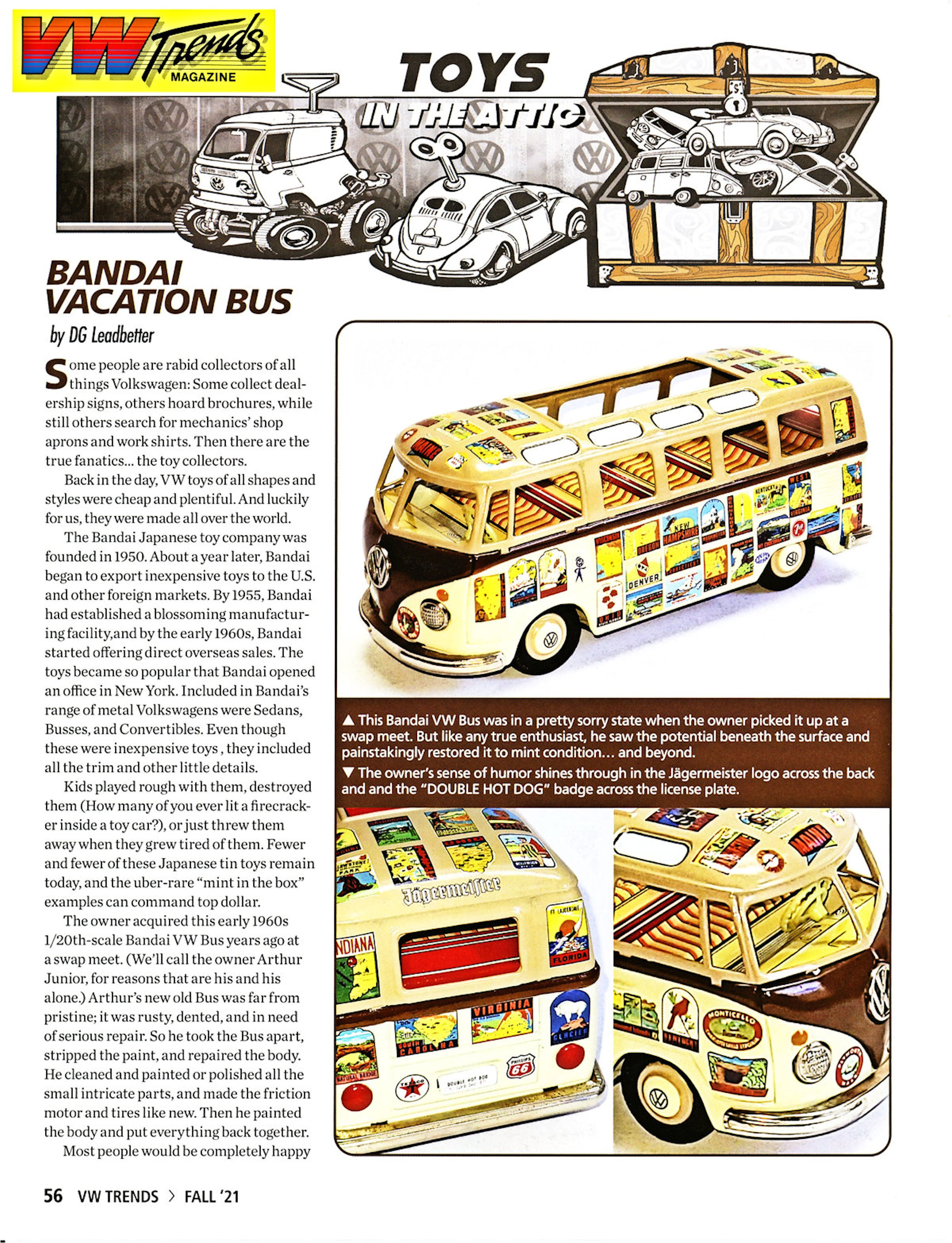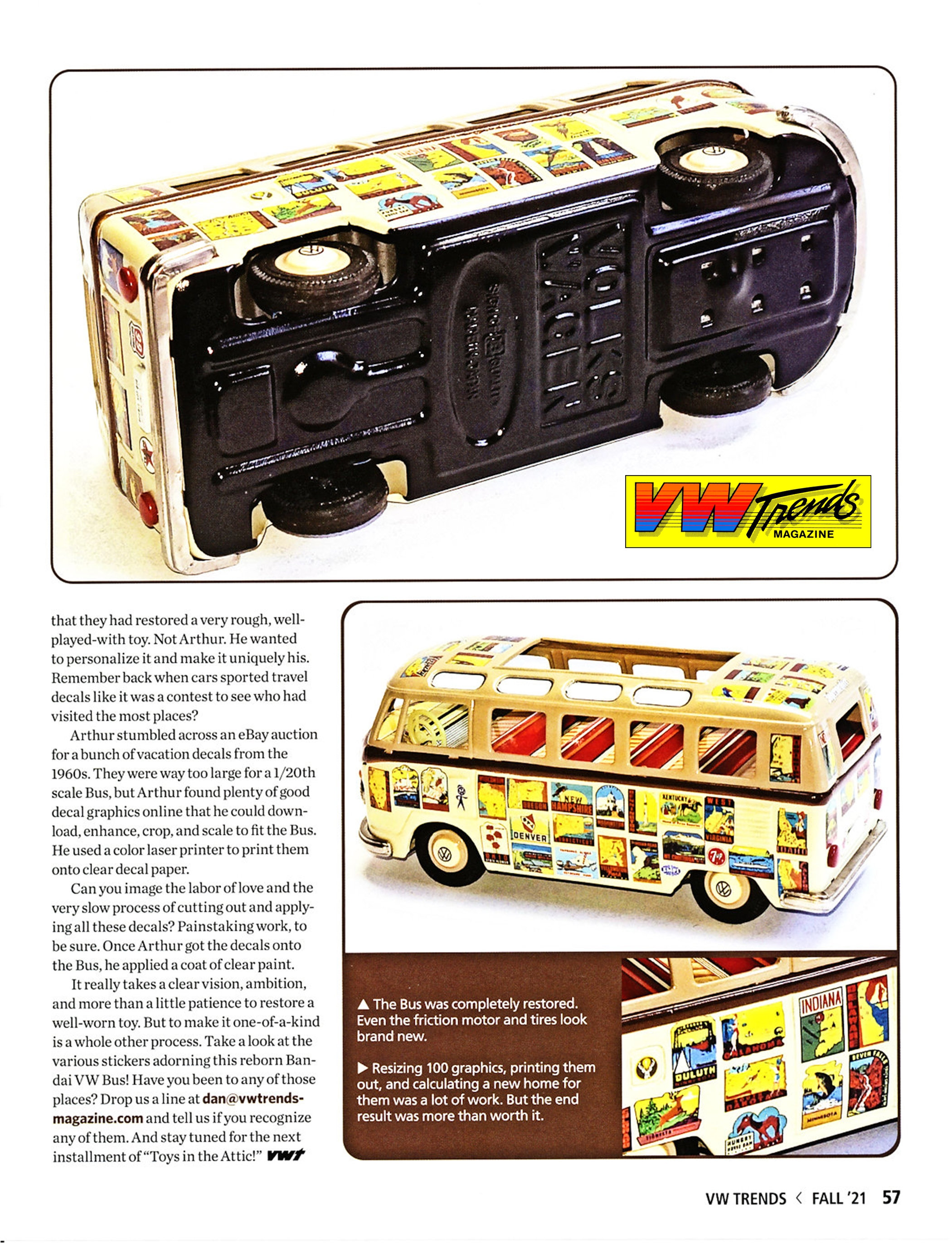 Do you remember as a kid seeing cars with all those decals pasted all over the vehicle like it was a contest to see who visited the most places? He did too. With that said, the idea to make his Bandai toy car into a Vacation VW Bus theme was envisioned!