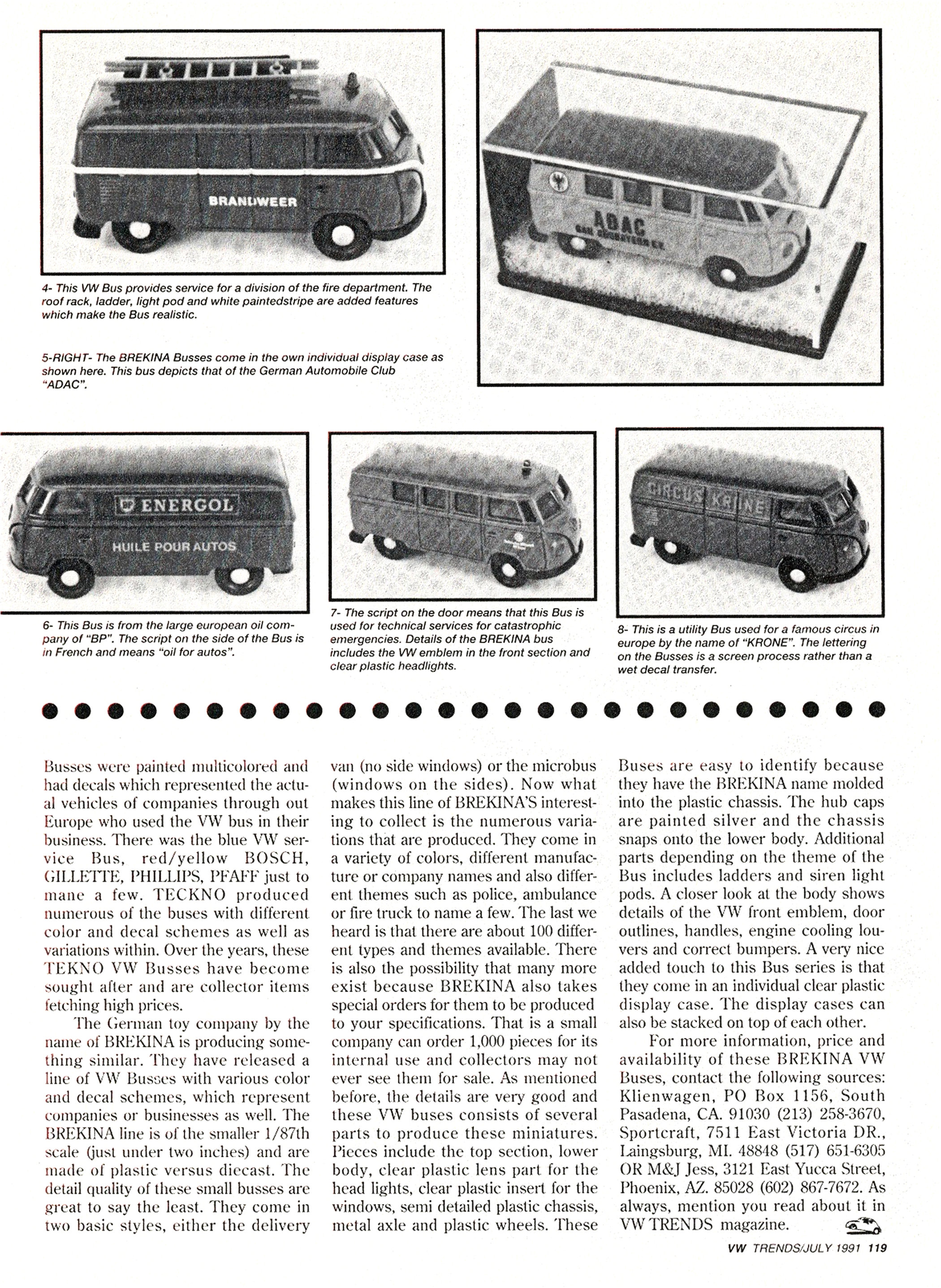 The German toy company by the name of BREKINA have released a line of VW Busses with various schemes, which represents companies or business as well. The BREKINA line is of the smaller 1/87 scale (just under 2 inches) and are made of plastic versus diecast.