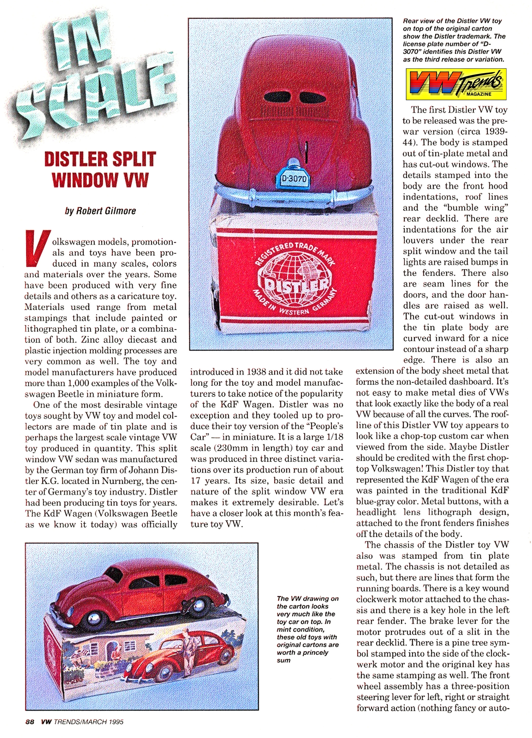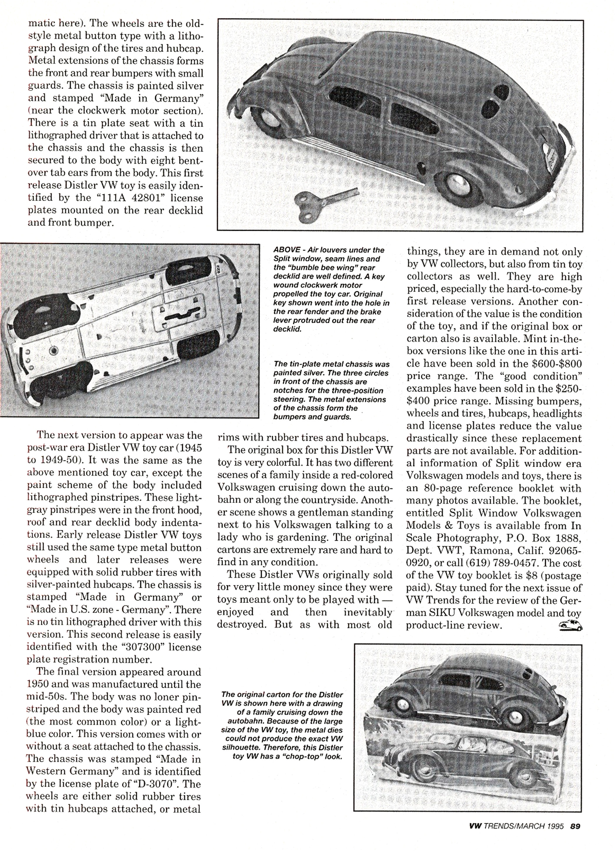 A very nicely painted, red, blue or green, tinplate body with cut out windows and tin lithographed button headlights. Tin plate chassis, usually painted silver or grey, with bumpers, rubber wheels and key wound clockwork motor with or without a brake lever protruding out of the rear hood.